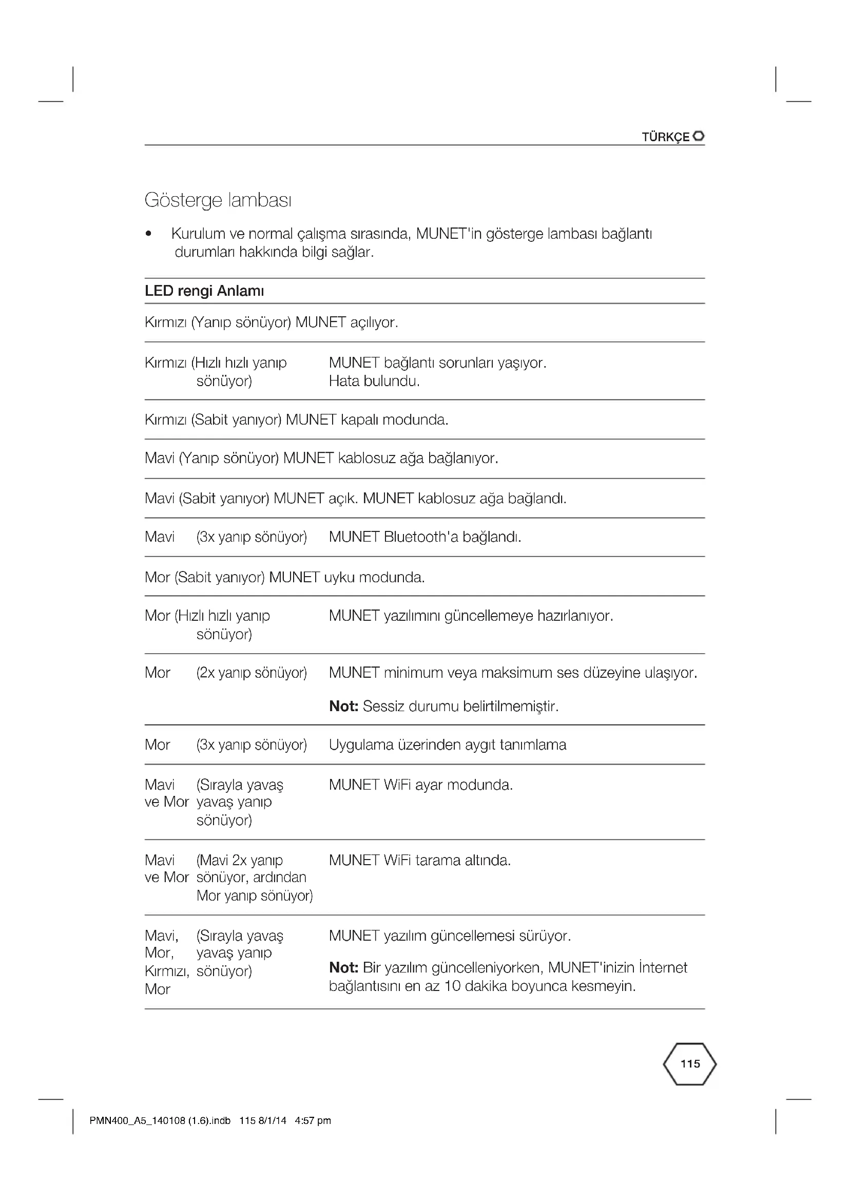 - Kurulum ve normal çalışma sırasında, MUNET'in gösterge lambası bağlantı durumları hakkında bilgi sağlar. LED rengi Anlamı Kırmızı (Yanıp sönüyor) MUNET açılıyor. Kırmızı (Hızlı hızlı yanıp sönüyor) MUNET bağlantı sorunları yaşıyor. Hata bulundu. Kırmızı (Sabit yanıyor) MUNET kapalı modunda. Mavi (Yanıp sönüyor) MUNET kablosuz ağa bağlanıyor. Mavi (Sabit yanıyor) MUNET açık. MUNET kablosuz ağa bağlandı. Mavi (3x yanıp sönüyor) MUNET Bluetooth'a bağlandı. Mor (Sabit yanıyor) MUNET uyku modunda. Mor (Hızlı hızlı yanıp sönüyor) MUNET yazılımını güncellemeye hazırlanıyor. Mor (2x yanıp sönüyor) MUNET minimum veya maksimum ses düzeyine ulaşıyor. Not: Sessiz durumu belirtilmemiştir. Mor (3x yanıp sönüyor) Uygulama üzerinden aygıt tanımlama Mavi ve Mor (Sırayla yavaş yavaş yanıp sönüyor) MUNET WiFi ayar modunda. Mavi ve Mor (Mavi 2x yanıp sönüyor, ardından Mor yanıp sönüyor) MUNET WiFi tarama altında. Mavi, Mor, Kırmızı, Mor (Sırayla yavaş yavaş yanıp sönüyor) MUNET yazılım güncellemesi sürüyor. Not: Bir yazılım güncelleniyorken, MUNET'inizin İnternet bağlantısını en az 10 dakika boyunca kesmeyin. PMN400_A5_140108 (1.6).indb 115 8/1/14 4:57 pmTÜRKÇE