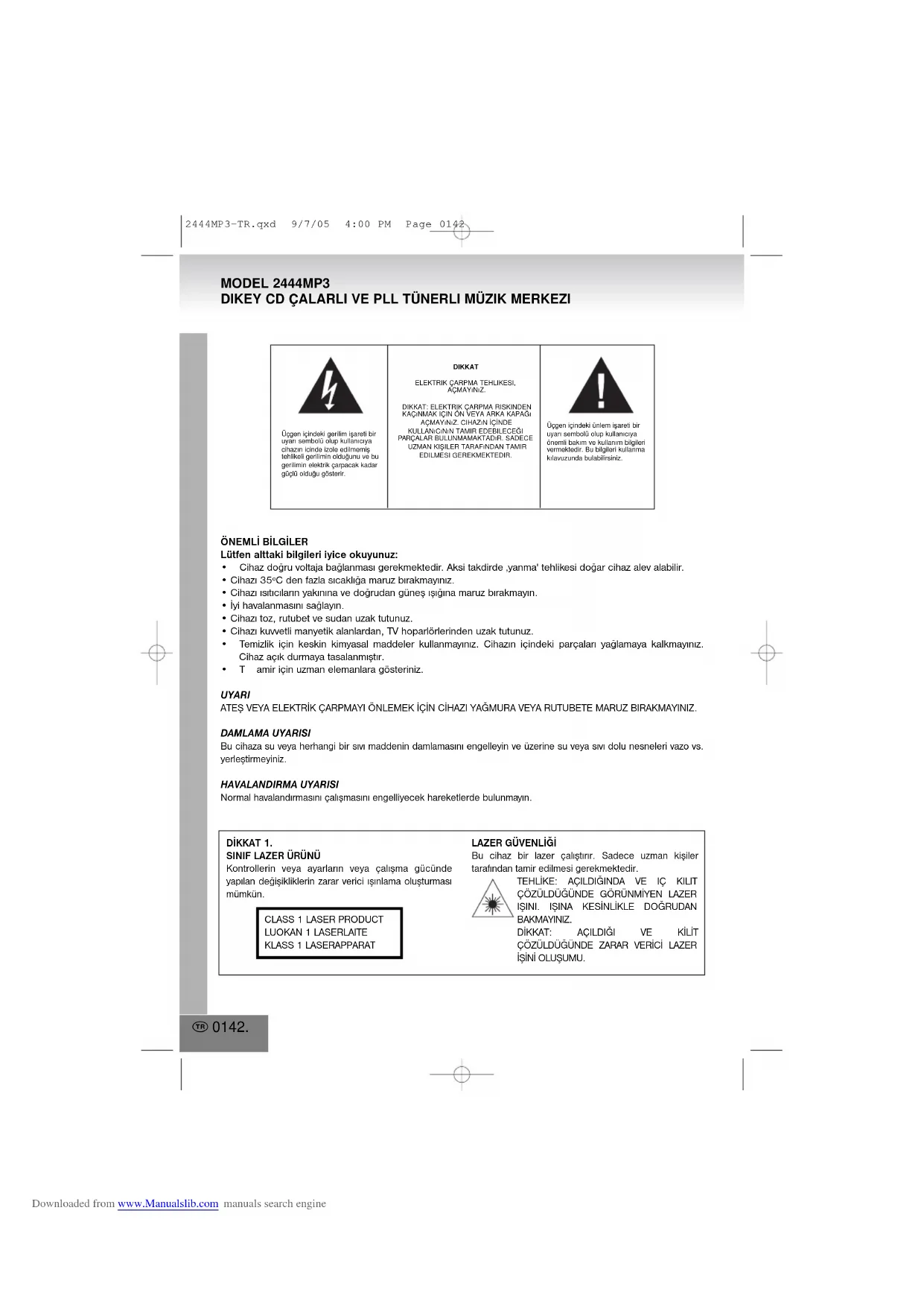 2444MP3-CZ.qxd 9/7/05 3:51 PM Page 0141 Downloaded from www.Manualslib.com manuals search engineÖNEMLİ BİLGİLERLütfen alttaki bilgileri iyice okuyunuz: