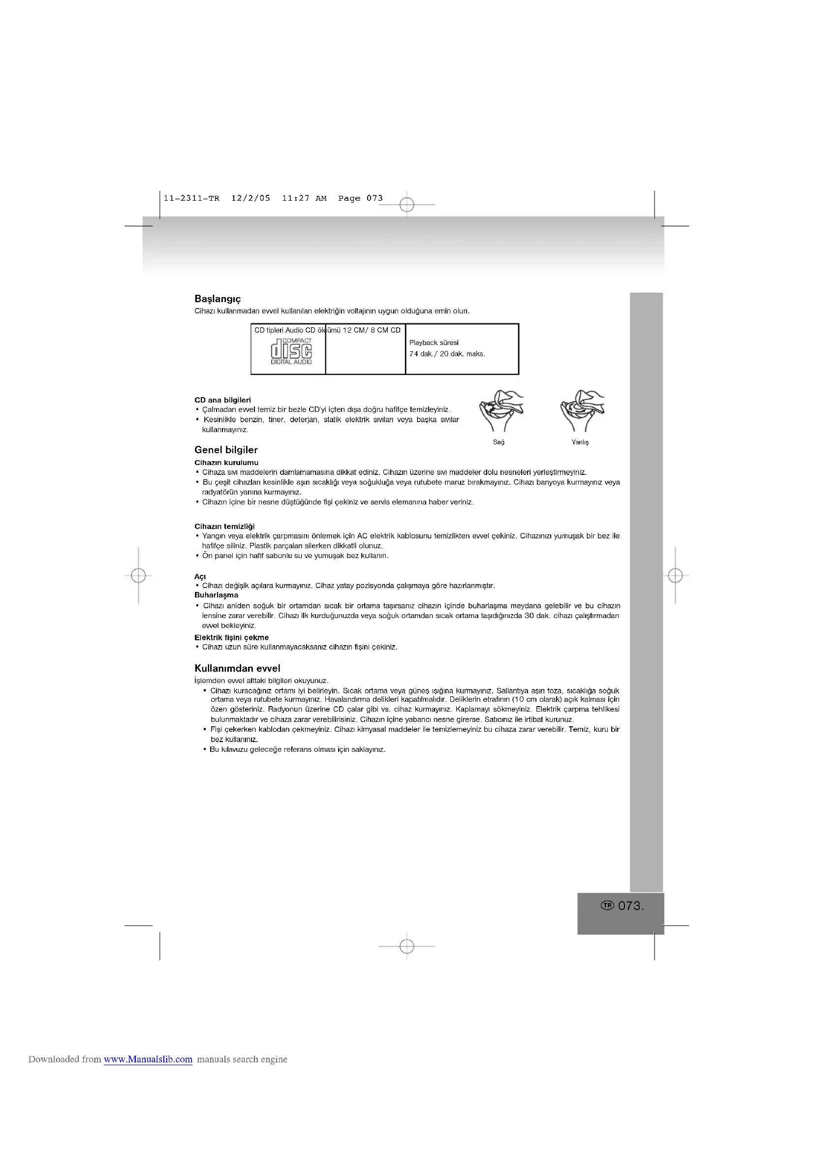 10-2311-CZ 12/2/05 11:18 AM Page 072 Downloaded from www.Manualslib.com manuals search engineBaþlangýç Cihazý kullanmadan evvel kullanýlan elektriðin voltajýnýn uygun olduðuna emin olun.CD ana bilgileri• Çalmadan evvel temiz bir bezle CD’yi içten dýþa doðru hafifçe temizleyiniz.• Kesinlikle benzin, tiner, deterjan, statik elektrik sývýlarý veya baþka sývýlarkullanmayýnýz. Genel bilgiler Cihazýn kurulumu• Cihaza sývý maddelerin damlamamasýna dikkat ediniz. Cihazýn üzerine sývý maddeler dolu nesneleri yerleþtirmeyiniz.