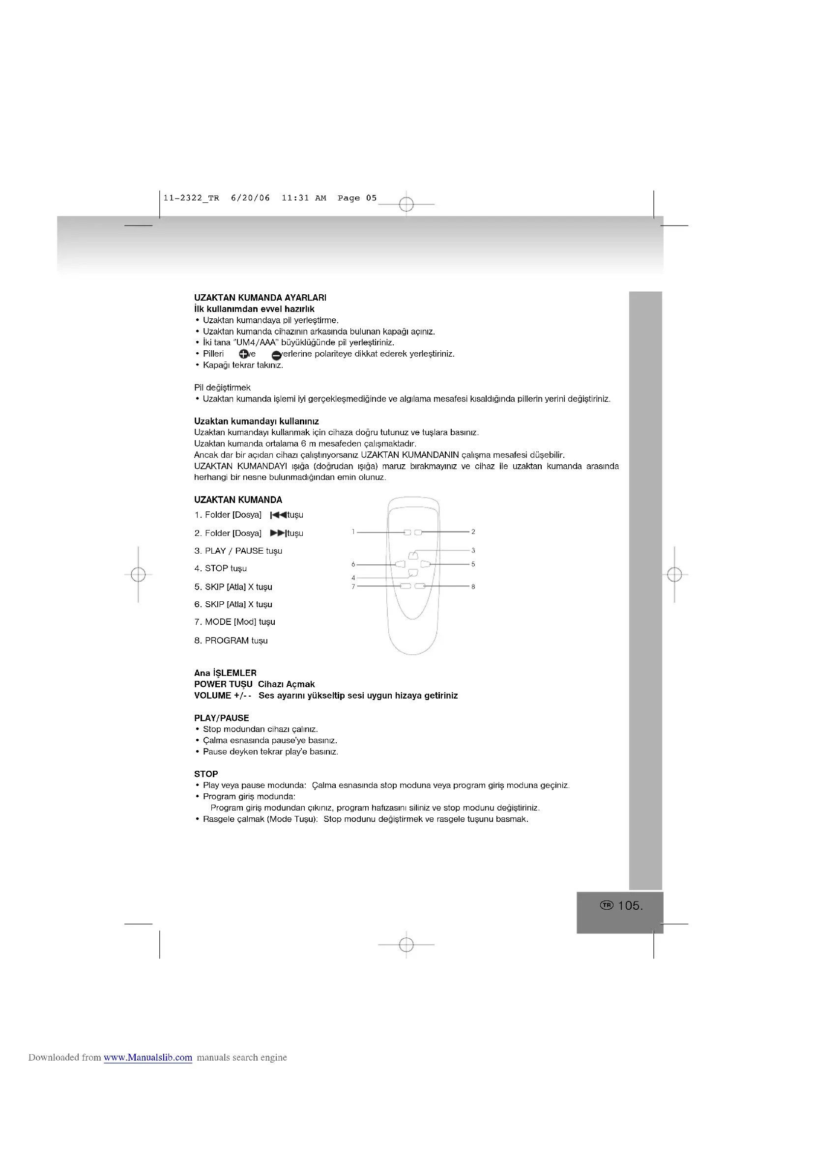 11-2322_TR 6/20/06 11:31 AM Page 04 Downloaded from www.Manualslib.com manuals search engineUZAKTAN KUMANDA AYARLARIÝlk kullanýmdan evvel hazýrlýk• Uzaktan kumandaya pil yerleþtirme.• Uzaktan kumanda cihazýnýn arkasýnda bulunan kapaðý açýnýz.• Ýki tana ‘’UM4/AAA’’ büyüklüðünde pil yerleþtiriniz.• Pilleri ve yerlerine polariteye dikkat ederek yerleþtiriniz.• Kapaðý tekrar takýnýz.Pil deðiþtirmek• Uzaktan kumanda iþlemi iyi gerçekleþmediðinde ve algýlama mesafesi kýsaldýðýnda pillerin yerini deðiþtiriniz.Uzaktan kumandayý kullanýnýzUzaktan kumandayý kullanmak için cihaza doðru tutunuz ve tuþlara basýnýz.Uzaktan kumanda ortalama 6 m mesafeden çalýþmaktadýr.Ancak dar bir açýdan cihazý çalýþtýrýyorsanýz UZAKTAN KUMANDANIN çalýþma mesafesi düþebilir.UZAKTAN KUMANDAYI ýþýða (doðrudan ýþýða) maruz býrakmayýnýz ve cihaz ile uzaktan kumanda arasýndaherhangi bir nesne bulunmadýðýndan emin olunuz. UZAKTAN KUMANDA1. Folder [Dosya] tuþu2. Folder [Dosya] tuþu3. PLAY / PAUSE tuþu4. STOP tuþu5. SKIP [Atla] X tuþu6. SKIP [Atla] X tuþu7. MODE [Mod] tuþu8. PROGRAM tuþuAna ÝÞLEMLERPOWER TUÞU Cihazý AçmakVOLUME +/- - Ses ayarýný yükseltip sesi uygun hizaya getirinizPLAY/PAUSE• Stop modundan cihazý çalýnýz.• Çalma esnasýnda pause’ye basýnýz.• Pause deyken tekrar play’e basýnýz. STOP
