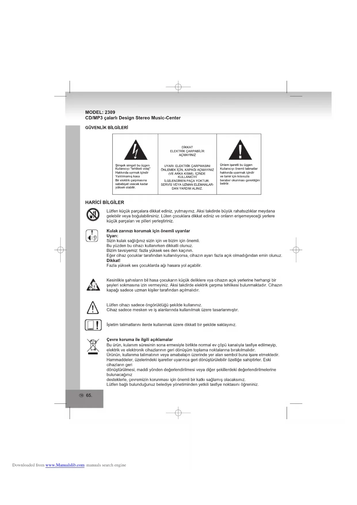 PROGRAMMERENEr kunnen voor het afspelen van de disk tot 20 tracks, in elke volgorde, worden geprogrammeerd.Zorg dat u op de “STOP” knop drukt voor gebruik. 1. Druk op de “PROGRAM” knop op de afstandsbediening, het display zal “P01” weergeven en knipperen.2. Selecteer de gewenste track door de “SKIP +” of “SKIP -” knop te gebruiken. (U kunt het gewenste album selecteren door op de “ALBUM” knop te drukken.)3. Druk nogmaals op de “PROGRAM” knop op de afstandsbediening om de gewenste track te bevestigen in het programmeergeheugen.4. Herhaal stap 2 en 3 om de aanvullende tracks in het programmeergeheugen te zetten.5. Wanneer alle gewenste tracks geprogrammeerd zijn, drukt u op de “PLAY / PAUSE / USB” knop om de disk af te spelen in de volgorde die u geprogrammeerd hebt.6. Druk twee keer op de “STOP” knop om geprogrammeerd afspelen af te breken.MODUSDruk voor of tijdens het afspelen van CD / MP3 / WMA disks op de “MODE” knop, bij elke druk op de knop wijzigt de modusfunctie als volgt:1 - REPEAT 12 - REPEAT ALBUM (*ALLEEN MP3 / WMA )3 - REPEAT ALL4 - RANDOM5 - NORMAL PLAYBACKREPEAT 1 REP REP ALBUM REP ALL REPEATALBUMREPEAT ALL NORMALPLAYBACK RAND RANDOM SPECIFICATIES ALGEMEENVermogenstoevoer : AC 230V ~ 50HzBandbreedtebereik : AM 525 - 1615kHz FM 87,5 - 108MHz(De specificaties kunnen veranderen zonder dat dit wordt aangegeven) Downloaded from www.Manualslib.com manuals search engine65. MODEL: 2309 CD/MP3 çalarlı Design Stereo Music-Center Ünlem işaretli bu üçgenKullanıcıyı önemli talimatlarhakkında uyarmak içindirve tamir için kılavuzlaberaber okunması gerektiğinibelirtir.Şimşek simgeli bu üçgenKullanıcıyı "tehlikeli votaj"Hakkında uyrmak içindirYalıtılmamış kasaBir elektrik çarpmasınasebebiyet veecek kadaryüksek olabilir.DİKKATELEKTRİK ÇARPABİLİRAÇMAYINIZUYARI: ELEKTRİK ÇARPMASINIÖNLEMEK İÇİN, KAPAĞI AÇMAYINIZ(VE ARKA KISMI). İÇİNDEKULLANICIYIİLGİLENDİREN PAÇA YOKTUR. SERVİS VEYA UZMAN ELEMANLAR-DAN YARDIM ALINIZ.GÜVENLİK BİLGİLERİLütfen küçük parçalara dikkat ediniz, yutmayınız. Aksi takdirde büyük rahatsızlıklar meydana gelebilir veya boğulabilirsiniz. Lüten çocuklara dikkat ediniz ve onların erişemeyeceği yerlere küçük parçaları ve pilleri yerleştiriniz.Kulak zarınızı korumak için önemli uyarılarUyarı:Sizin kulak sağlığınız sizin için ve bizim için önemli.Bu yüzden bu cihazı kullanırken dikkatli olunuz.Bizim tavsiyemiz: fazla yüksek ses den kaçının.Eğer cihaz çocuklar tarafından kullanılıyorsa, cihazın ayarı fazla açık olmadığından emin olunuz.Dikkat!Fazla yüksek ses çocuklarda ağı hasara yol açabilir.Kesinlikle şahısların bil hasa çocukarın küçük deliklere vya cihazın açık yerlerine herhangi bir şeyleri sokmasına izin vermeyiniz. Aksi takdirde elektrik çarpma tehlikesi bulunmaktadır. Cihazın kapağı sadece uzman kişiler tarafından açılmalıdır. Lütfen cihazı sadece öngörüldüğü şekilde kullanınız.Cihaz sadece mesken ve iş alanlarında kullanılmak üzere tasarlanmıştır.İşletim talimatlarını ilerde kullanmak üzere dikkatl bir şekilde saklayınız.Çevre koruma ile ilgili açıklamalar Bu ürün, kulanım süresinin sona ermesiyle birlikte normal ev çöpü kanalıyla tasfiye edilmeyip, elektrik ve elektronik cihazlarının geri dönüşüm toplama noktalarına bırakılmalıdır.Ürünün, kullanma talimatının veya amabalajın üzerinde yer alan sembol buna işare etmektedir.Hammaddeler, üzelerindeki işaretler uyarınca geri dönüştürülebilir özelliğe sahiptirler. Eski cihazların geridönüştürülmesi, maddi yönden değerlendirilmesi veya diğer şekillerdeki değerlendirilmelerine bulunacağınızdesteklerle, çevremizin korunması için önemli bir katkı sağlamış olacaksınız.Lütfen bağlı bulunduğunuz belediye yönetiminden yetkili tasfiye noktasını öğreniniz.
