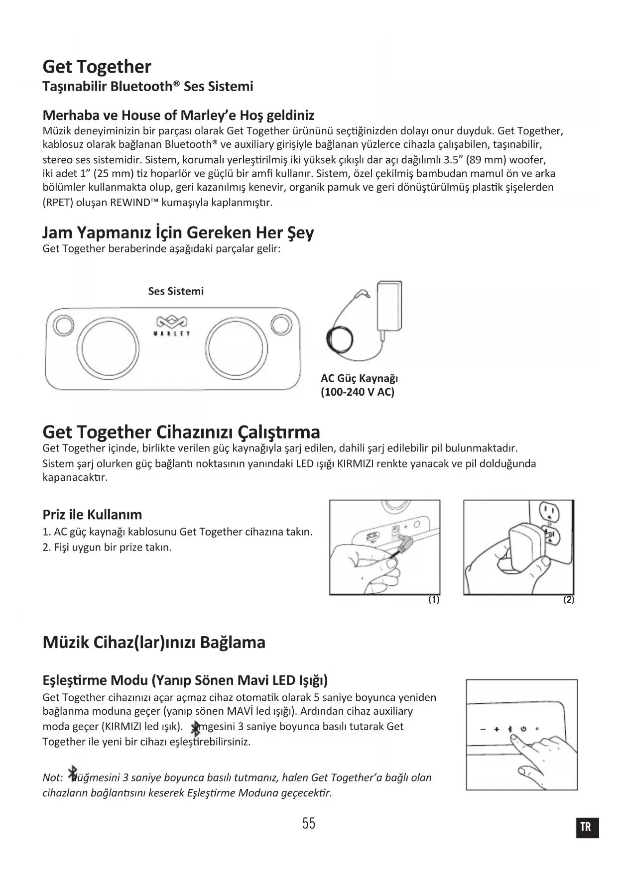 Este simbolo indica que as pilhas nao podem ser eliminadas juntamente com o lixo domestico, dado que contem substancias que podem ser prejudiciais para o meio ambiente e a saude. As pilhas devem ser eliminadas nos pontos de recolha designados. PT55 Get Together Taşınabilir Bluetooth® Ses Sistemi Merhaba ve House of Marley’e Hoş geldiniz Müzik deneyiminizin bir parçası olarak Get Together ürününü seçğinizden dolayı onur duyduk. Get Together, kablosuz olarak bağlanan Bluetooth® ve auxiliary girişiyle bağlanan yüzlerce cihazla çalışabilen, taşınabilir, stereo ses sistemidir. Sistem, korumalı yerleşrilmiş iki yüksek çıkışlı dar açı dağılımlı 3.5” (89 mm) woofer, iki adet 1” (25 mm) z hoparlör ve güçlü bir am kullanır. Sistem, özel çekilmiş bambudan mamul ön ve arka bölümler kullanmakta olup, geri kazanılmış kenevir, organik pamuk ve geri dönüştürülmüş plask şişelerden (RPET) oluşan REWIND™ kumaşıyla kaplanmışr. Jam Yapmanız İçin Gereken Her Şey Get Together beraberinde aşağıdaki parçalar gelir: Ses Sistemi AC Güç Kaynağı (100-240 V AC) Get Together Cihazınızı Çalışrma Get Together içinde, birlikte verilen güç kaynağıyla şarj edilen, dahili şarj edilebilir pil bulunmaktadır. Sistem şarj olurken güç bağlan noktasının yanındaki LED ışığı KIRMIZI renkte yanacak ve pil dolduğunda kapanacakr. Priz ile Kullanım