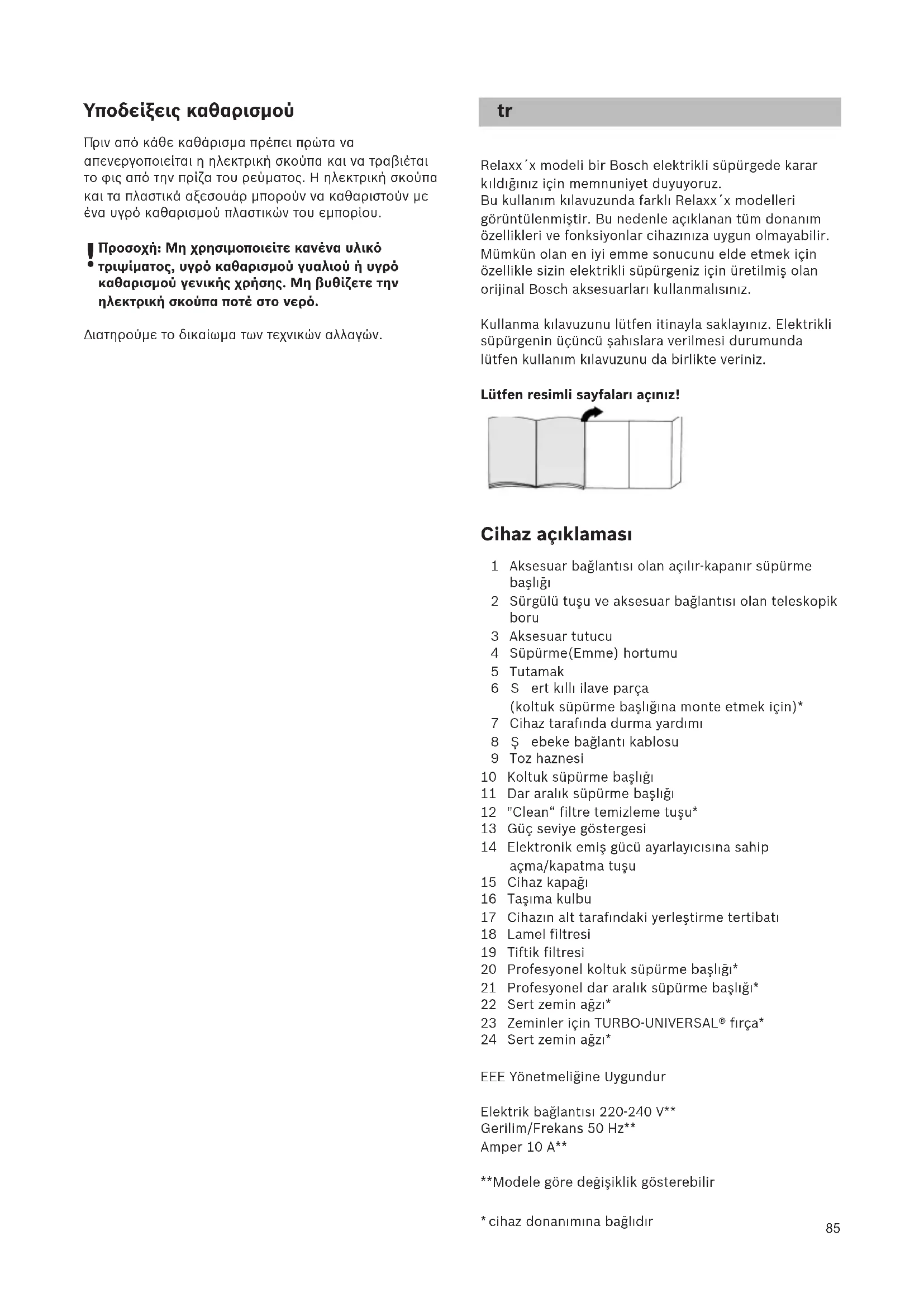 rijinal Bosch aksesuarları kullanmalısınız. Kullanma kılavuzunu lütfen itinayla saklayınız. Elektrikli süpürgenin üçüncü şahıslara verilmesi durumunda lütfen kullanım kılavuzunu da birlikte veriniz. Lütfen resimli sayfaları açınız! Cihaz açıklaması 1 Aksesuar bağlantısı olan açılır-kapanır süpürme başlığı 2 Sürgülü tuşu ve aksesuar bağlantısı olan teleskopik boru 3 Aksesuar tutucu 4 Süpürme(Emme) hortumu 5 Tutamak 6Sert kıllı ilave parça (koltuk süpürme başlığına monte etmek için)* 7 Cihaz tarafında durma yardımı 8Şebeke bağlantı kablosu 9 Toz haznesi 10 Koltuk süpürme başlığı 11 Dar aralık süpürme başlığı 12 "Clean“ filtre temizleme tuşu* 13 Güç seviye göstergesi 14 Elektronik emiş gücü ayarlayıcısına sahip açma/kapatma tuşu 15 Cihaz kapağı 16 Taşıma kulbu 17 Cihazın alt tarafındaki yerleştirme tertibatı 18 Lamel filtresi 19 Tiftik filtresi 20 Profesyonel koltuk süpürme başlığı* 21 Profesyonel dar aralık süpürme başlığı* 22 Sert zemin ağzı* 23 Zeminler için TURBO-UNIVERSAL® fırça* 24 Sert zemin ağzı* EEE Yönetmeliğine Uygundur Elektrik bağlantısı 220-240 V** Gerilim/Frekans 50 Hz** Amper 10 A** **Modele göre değişiklik gösterebilir
