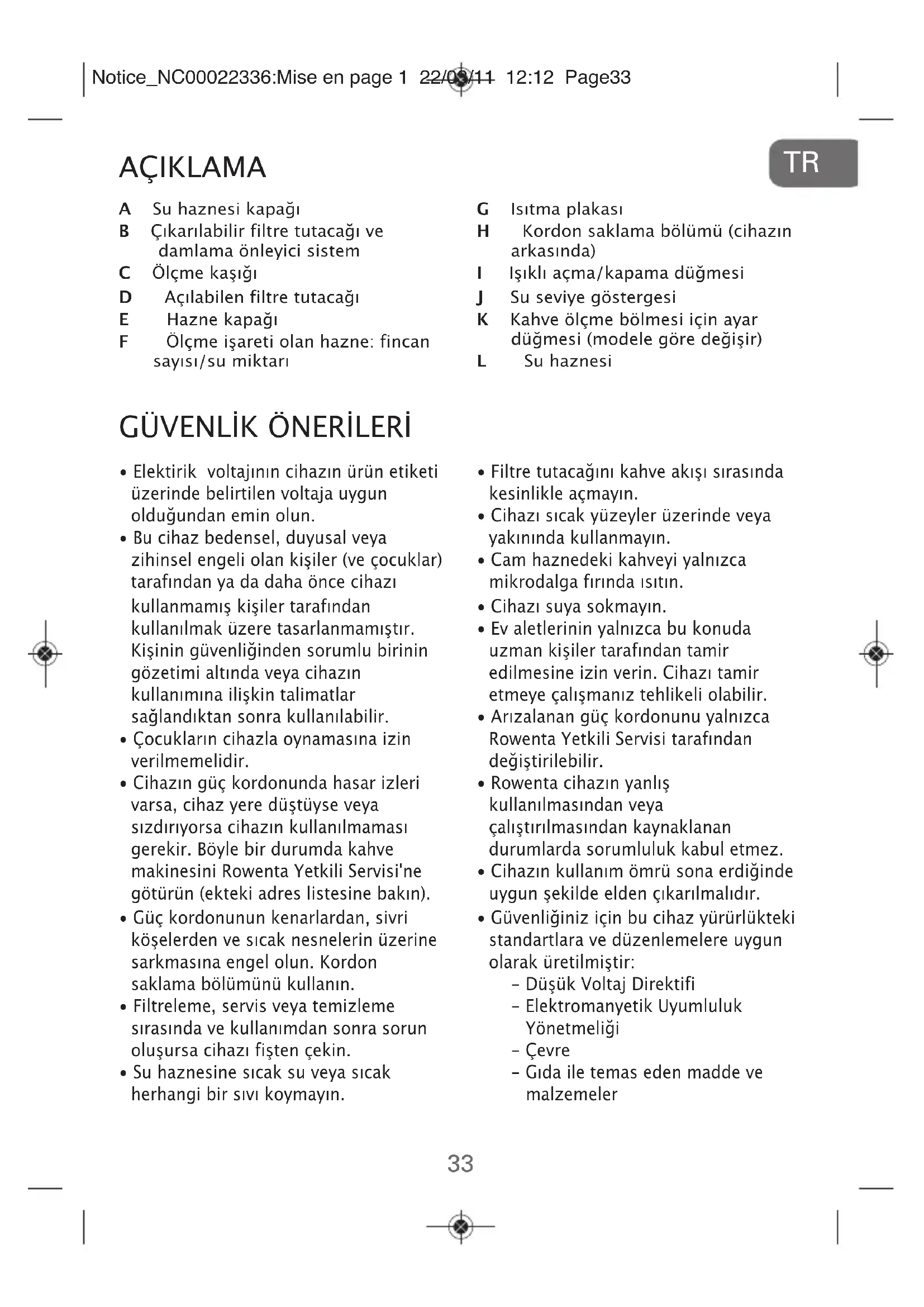 - Cihazınız yalnızca evde kullanılmak üzere tasarlanmıştır. Garanti kapsamına girmeyen şu alanlarda kullanılmak üzere tasarlanmamıştır: - Mağazalarda, iş yerlerinde ve diğer çalışma ortamlarında çalışanlara ayrılmış mutfaklarda, - Çiftlik evlerinde, - Otellerde, pansiyonlarda ve diğer konaklama yerlerinde müşteriler tarafından kullanılması, Notice_NC00022336:Mise en page 1 22/03/11 12:12 Page3435