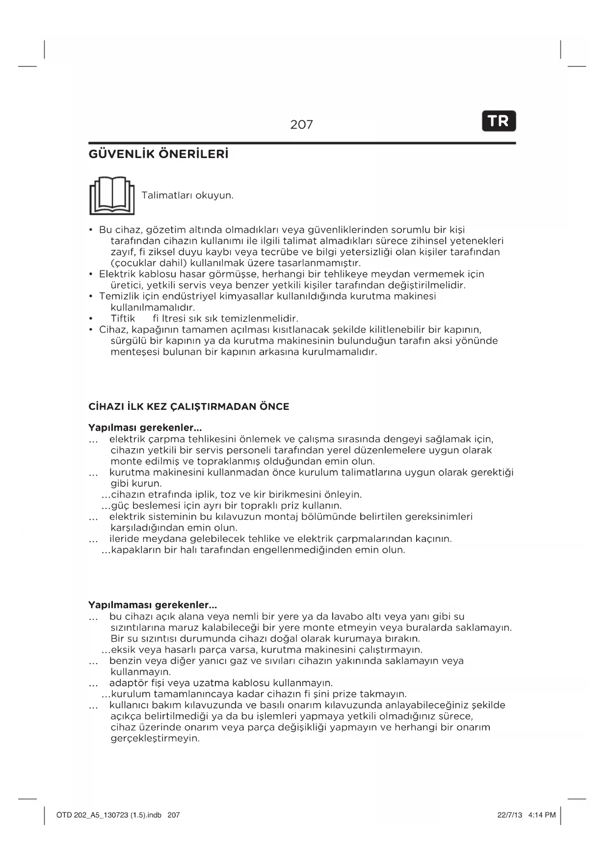 ... yangin cikmasini onlemek icin plastik, kopuk veya benzer dokulu kaucuk benzeri malzemeler ya da pelus iceren parcalari kurutmak icin isitmayin.