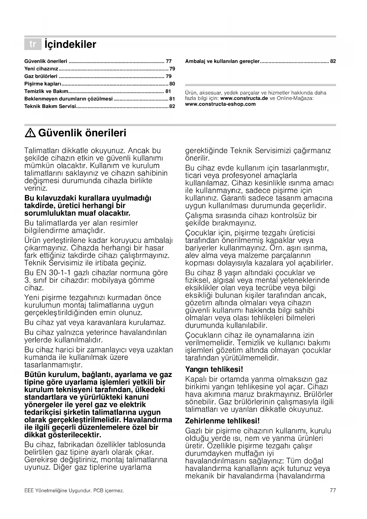 cihaz. Yeni pişirme tezgahınızı kurmadan önce kurulumun montaj talimatlarına uygun gerçekleş tirildiğinden emin olunuz. Bu cihaz yat veya karavanlara kurulamaz. Bu cihaz yalnızca yeterince havalandırılan yerlerde kullanılmalıdır. Bu cihaz harici bir zamanlayıcı veya uzaktan kumanda ile kullanılmak üzere tasarlanmamıştır. Bütün kurulum, bağlantı, ayarlama ve gaz tipine göre uyarlama işlemleri yetkili bir kurulum teknisyeni tarafından, ülkedeki standartlara ve yürürlükteki kanuni yönergeler ile yerel gaz ve elektrik tedarikçisi şirketin talimatlarına uygun olarak gerçekleştirilmelidir. Havalandırma ile ilgili geçerli düzenlemelere özel bir dikkat gösterilecektir. Bu cihaz, fabrikadan özellikler tablosunda belirtilen gaz tipine ayarlı olarak çıkar. Gerekirse değiştiriniz, montaj talimatlarına uyunuz. Diğer gaz tiplerine uyarlama gerektiğinde Teknik Servisimizi çağırmanız önerilir. Bu cihaz evde kullanım için tasarlanmıştır, ticari veya profesyonel amaçlarla kullanılamaz. Cihazı kesinlikle ısınma amacı ile kullanmayı nız, sadece pişirme için kullanınız. Garanti sadece tasarım amacına uygun kullanılması durumunda geçerlidir. Çalışma sırasında cihazı kontrolsüz bir şekilde bırakmayınız. Çocuklar için, pişirme tezgahı üreticisi tarafından önerilmemiş kapaklar veya bariyerler kullanmayınız. Örn. aşırı ısınma, alev alma veya malzeme parçalarının kopması dolayısıyla kazalara yol açabilirler. Bu cihaz 8 yaşın altındaki çocuklar ve fiziksel, algısal veya mental yeteneklerinde eksiklikler olan veya tecrübe veya bilgi eksikliği bulunan kişiler tarafından ancak, gözetim altında olmaları veya cihazın güvenli kullanımı hakk ında bilgi sahibi olmaları veya olası tehlikeleri bilmeleri durumunda kullanılabilir. Çocukların cihaz ile oynamalarına izin verilmemelidir. Temizlik ve kullanıcı bakımı işlemleri gözetim altında olmayan çocuklar tarafından yürütülmemelidir. Yangın tehlikesi! Kapalı bir ortamda yanma olmaksızın gaz birikimi yangın tehlikesine yol açar. Cihazı hava akımına maruz bırakmayınız. Brülörler sönebilir. Gaz brülörlerinin çalışmasıyla ilgili talimatları ve uyarıları dikkatle okuyunuz. Zehirlenme tehlikesi! Gazlı bir pişirme cihazının kullanımı, kurulu olduğu yerde ısı, nem ve yanma ürünleri üretir. Özellikle pişirme tezgahı çalışır durumdayken mutfağın iyi havalandırılmasını sağlayınız: Tüm doğal havalandırma kanallarını açık tutunuz veya mekanik bir havalandırma (havalandırma78 fanı) cihazı kurunuz. Cihazın yoğun bir şekilde ve uzun süre kullanımı, tamamlayıcı veya daha etkili bir havalandırma gerektirebilir: Bir pencere açınız veya mekanik havalandırmanın gücünü arttırınız. Yanma tehlikesi! Pişirme bölümleri ve etrafındakiler çok ısınır. Sıcak yüzeylere kesinlikle dokunmayınız. 8 yaşından küçük çocukları uzak tutunuz. Yangın tehlikesi!