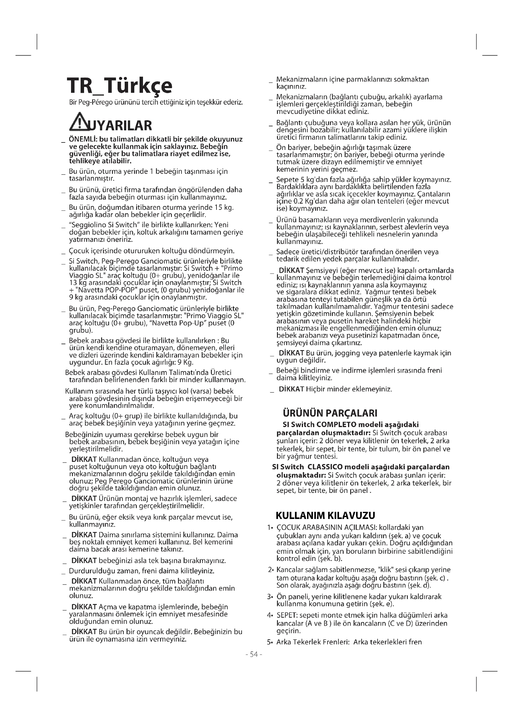 kilitleyin. Kolların üzerindeki çubukları, bir "klik" sesi duyana kadar yukarı kaldırın (aynı anda sadece birisini) (şek. a). 19• Merkezi kolu kavrayın ve çocuk arabası kapanana (katlanana) kadar yukarı doğru çekin. İskeletin düzgün katlandığından emin olmak için emniyet kayışını kontrol edin. Kapalı haldeki bir çocuk arabası dik duracaktır. 20• Koltuğu çözmeniz halinde çocuk arabası daha az yer kaplayacak biçimde katlanacaktır (paragraf 17). 21• TAŞIMA: Çocuk arabası, merkezi koldan tutularak rahatça taşınabilir (ön tekerlekler sabit hale getirilerek) (şek. a). Dilerseniz yan koldan da taşıyabilirsiniz (şek. b). 22• ÖRTÜNÜN ÇIKARILMASI: Örtüyü çocuk arabasından çıkarmak için; koltuğu iskeletten ayırın (paragraf 17a), örtüyü ayak dayamanın üzerinden çekin (şek. a), 4 lastik bandı sırtlığın yanlarından ayırın (şek. b), kasık kayışını çıkarın (şek.c), 23• sırtlığın her iki tarafında bulunan sert tırnakları açın ve çıkarın (şek_d); ki tokayı çekerek çıkarın (şek. e), kayışın her iki tarafta bulunan iki vidasını, somunu sabit tutmak için bir pens ve vidayı sökmek için bir tornavida kullanarak sökün (şek. f), örtüyü üst kısımdan çıkarın. NAVETTA POP-UP ve PRIMO VIAGGIO SL'in BAĞLANMASI 24• NAVETTA POP-UP: Ayrı olarak satılan Navetta Pop- Up puset’i iskelete sabitlemek için, ilave aksesuar olarak satılan adaptörleri satın almanız gerekir. Puseti düzgün bir şekilde sabitlemek için ilgili kullanım kılavuzuna başvurun.- 56 - PRIMO VIAGGIO SL: Ayrı olarak satılan Primo Viaggio SL araç koltuğunu bağlamak için, ilave aksesuar olarak satılan adaptörleri satın almanız gerekir. Araç koltuğunu düzgün bir şekilde sabitlemek için ilgili kullanım kılavuzuna başvurun. SERİ NUMARALARI 25• Si Switch koltukta aşağıdaki bilgiler mevcuttur: Ürün adı, üretim tarihi ve seri numarası. Bu bilgileri, olası bir talebinizde kullanmanız gerekebilir (şek. a). Si Switch sırtlığında aşağıdaki bilgiler mevcuttur: Ürün adı, üretim tarihi ve seri numarası. Bu bilgileri, olası bir talebinizde kullanmanız gerekebilir (şek. b). AKSESUARLAR 26 • SİNEKLİK: Tenteye sabitlenebilir (şek_a). ÇANTA: bu bebek kıyafet/bakım çantası çocuk arabasına bağlanabilir (şek. b). BARDAK TUTUCU: iskeletin üzerindeki mantar şekilli düğmeye sabitlenebilir (şek. c). 27• SEYAHAT ÇANTASI: Çocuk arabasıyla uçağa binmek için pratik bir çantadır (şek. d). ADAPTÖRLERİ: PegPerego Primo Viaggio SL araç koltuğunu (0+ grubu), Navetta Pop-Up puset (0 grubu), iskelete sabitlemek içindir (şek. e). GÜNEŞLİK: pratik bir güneşlik (şek. f). DOLGULU MİNDER: Peg Perego yüksek sandalyeler ve çocuk arabaları için. Kışlık tarafı kapitone örme kumaş, yaslık tarafı ise %100 pamuktur (şek. g). VARIO FOOT MUFF: PegPerego çocuk arabaları için uyku tulumu (şek. h).