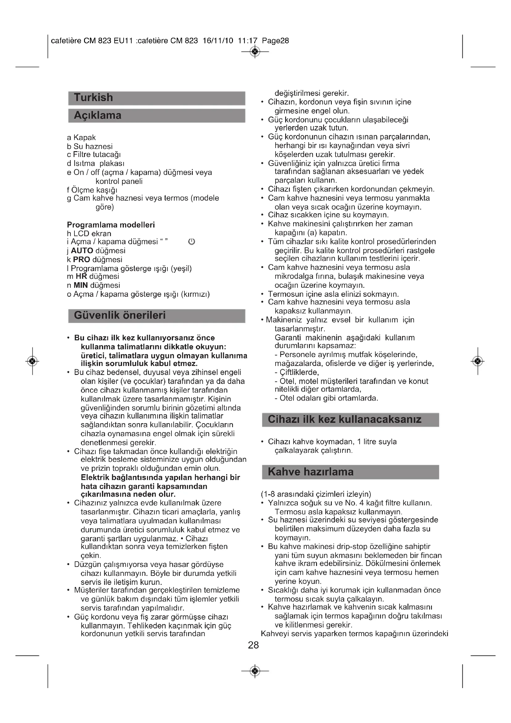 - Kahve hazırlamak ve kahvenin sıcak kalmasını sağlamak için termos kapağının doğru takılması ve kilitlenmesi gerekir. Kahveyi servis yaparken termos kapağının üzerindeki Turkish Açıklama Güvenlik önerileri Cihazı ilk kez kullanacaksanız Kahve hazırlama cafetière CM 823 EU11 :cafetière CM 823 16/11/10 11:17 Page2829 mandala basın.
