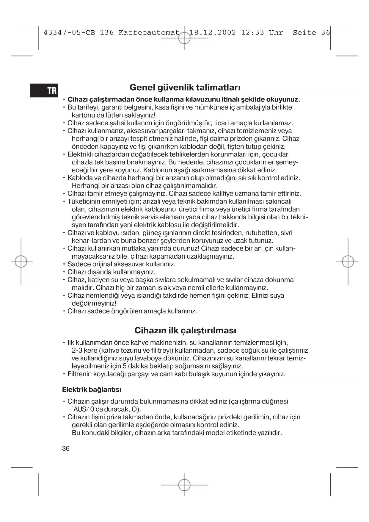 - Cihaz6n fişini prize takmadan önde, kullanacağ6n6z prizdeki gerilimin, cihaz için gerekli olan gerilimle eşdeğerde olmas6n6 kontrol ediniz. Bu konudaki bilgiler, cihaz6n arka taraf6ndaki model etiketinde yaz6l6d6r. 43347-05-CB 136 Kaffeeautomat 18.12.2002 12:33 Uhr Seite 3637
