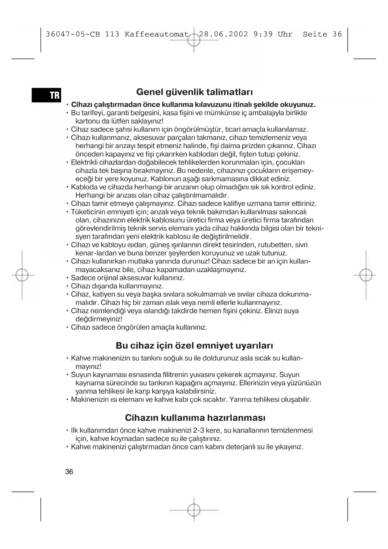 - Kahve makinenizi çalıştırmadan önce cam kabını deterjanlı su ile yıkayınız. 36047-05-CB 113 Kaffeeautomat 28.06.2002 9:39 Uhr Seite 3637