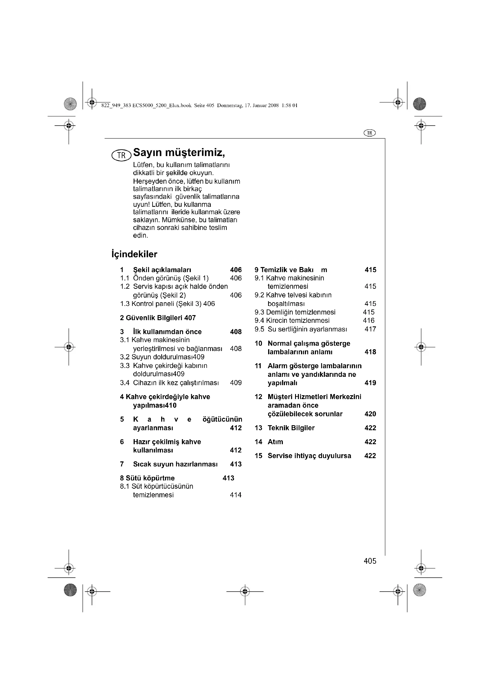 10 Normal çalışma gösterge lambalarının anlamı 418 11 Alarm gösterge lambalarının anlamı ve yandıklarında ne yapılmalı 419 12 Müşteri Hizmetleri Merkezini aramadan önce çözülebilecek sorunlar 42013 Teknik Bilgiler 42214 Atım 42215 Servise ihtiyaç duyulursa 422822_949_383 ECS5000_5200_Elux.book Seite 405 Donnerstag, 17. Januar 2008 1:58 01t