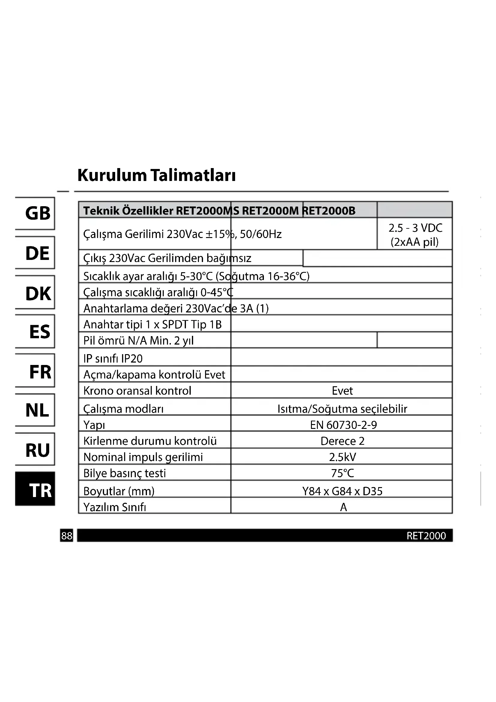 Teknik Özellikler RET2000MS RET2000M RET2000B Çalışma Gerilimi 230Vac ±15%, 50/60Hz