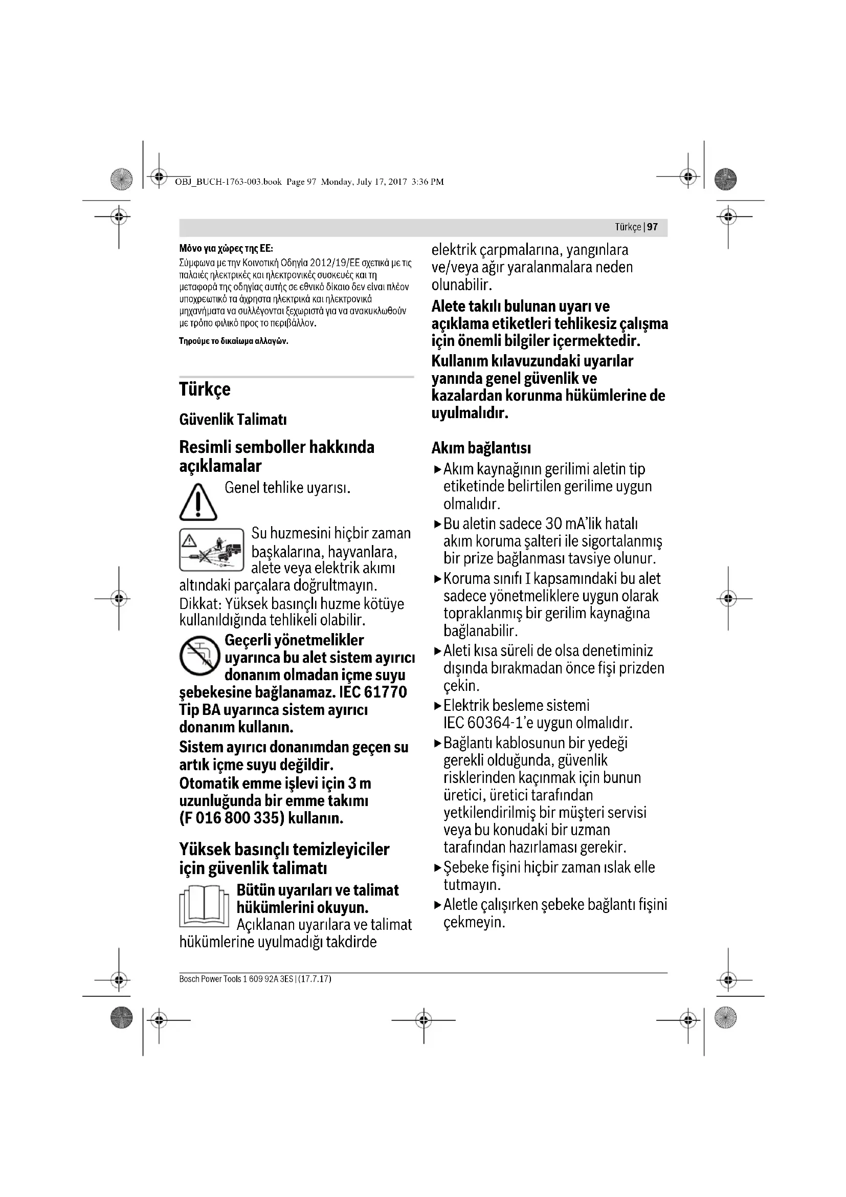 Η αντλία ή/και πιστόλι εκτόξευσης δεν είναι στεγανή/ό Απευθυνθείτε σε ένα εξουσιοδοτημένο κατάστημα Service της Bosch Η συσκευή δεν είναι στεγανή Η αντλία δεν είναι στεγανή Επιτρέπονται μόνο ελάχιστες διαρροές νερού. Απευθυνθείτε στο Service όταν οι διαρροές είναι μεγάλες Το απορρυπαντικό δεν αναρροφάται Το ρυθμιζόμενο ακροφύσιο βρίσκεται στη θέση Υψηλή πίεση Ρυθμίστε το ακροφύσιο στο «Lo» Το απορρυπαντικό είναι πολύ παχύρευστο Αραιώστε το με νερό Επιμηκύνθηκε ο σωλήνας υψηλής πίεσης Συνδέστε τον αυθεντικό σωλήνα Υπολείμματα ή στένωση στο σωλήνα του κυκλώματος του απορρυπαντικού Ξεπλύνετε το σωλήνα με καθαρό νερό και εξουδετερώστε τη στένωση. Όταν το προβλήμα δεν εξουδετερωθεί συμβουλευτείτε το Bosch Service Center. Συμπτώματα Πιθανή αιτία Θεραπεία OBJ_BUCH-1763-003.book Page 96 Monday, July 17, 2017 3:36 PMTürkçe | 97 Bosch Power Tools 1 609 92A 3ES | (17.7.17) Μόνο για χώρες της ΕΕ: Σύμφωνα με την Κοινοτική Οδηγία 2012/19/EE σχετικά με τις παλαιές ηλεκτρικές και ηλεκτρονικές συσκευές και τη μεταφορά της οδηγίας αυτής σε εθνικό δίκαιο δεν είναι πλέον υποχρεωτικό τα άχρηστα ηλεκτρικά και ηλεκτρονικά μηχανήματα να συλλέγονται ξεχωριστά για να ανακυκλωθούν με τρόπο φιλικό προς το περιβάλλον. Τηρούμε το δικαίωμα αλλαγών. Türkçe Güvenlik Talimatı Resimli semboller hakkında açıklamalar Genel tehlike uyarısı. Su huzmesini hiçbir zaman başkalarına, hayvanlara, alete veya elektrik akımı altındaki parçalara doğrultmayın. Dikkat: Yüksek basınçlı huzme kötüye kullanıldığında tehlikeli olabilir. Geçerli yönetmelikler uyarınca bu alet sistem ayırıcı donanım olmadan içme suyu şebekesine bağlanamaz. IEC 61770 Tip BA uyarınca sistem ayırıcı donanım kullanın. Sistem ayırıcı donanımdan geçen su artık içme suyu değildir. Otomatik emme işlevi için 3 m uzunluğunda bir emme takımı (F 016 800 335) kullanın. Yüksek basınçlı temizleyiciler için güvenlik talimatı Bütün uyarıları ve talimat hükümlerini okuyun. Açıklanan uyarılara ve talimat hükümlerine uyulmadığı takdirde elektrik çarpmalarına, yangınlara ve/veya ağır yaralanmalara neden olunabilir. Alete takılı bulunan uyarı ve açıklama etiketleri tehlikesiz çalışma için önemli bilgiler içermektedir. Kullanım kılavuzundaki uyarılar yanında genel güvenlik ve kazalardan korunma hükümlerine de uyulmalıdır. Akım bağlantısı Akım kaynağının gerilimi aletin tip etiketinde belirtilen gerilime uygun olmalıdır. Bu aletin sadece 30 mA’lik hatalı akım koruma şalteri ile sigortalanmış bir prize bağlanması tavsiye olunur. Koruma sınıfı I kapsamındaki bu alet sadece yönetmeliklere uygun olarak topraklanmış bir gerilim kaynağına bağlanabilir. Aleti kısa süreli de olsa denetiminiz dışında bırakmadan önce fişi prizden çekin. Elektrik besleme sistemi IEC 60364-1’e uygun olmalıdır. Bağlantı kablosunun bir yedeği gerekli olduğunda, güvenlik risklerinden kaçınmak için bunun üretici, üretici tarafından yetkilendirilmiş bir müşteri servisi veya bu konudaki bir uzman tarafından hazırlaması gerekir. Şebeke fişini hiçbir zaman ıslak elle tutmayın. Aletle çalışırken şebeke bağlantı fişini çekmeyin. OBJ_BUCH-1763-003.book Page 97 Monday, July 17, 2017 3:36 PM98 | Türkçe 1 609 92A 3ES | (17.7.17) Bosch Power Tools Şebeke bağlantı kablosunu veya uzatma kablosunu kırmayın, ezmeyin veya aleti bunların üzerinden geçirmeyin, aksi takdirde hasar görebilirler. Kabloyu sıcaktan, yağdan ve keskin kenarlı cisimlerden koruyun. Şebeke bağlantı kablosu ve yüksek basınç hortumu, püskürtme tabancası veya güvenlik donanımları gibi önemli parçalar hasarlı ise aleti kullanmayın. Dikkat: Yönetmeliklere uygun olmayan uzatma kabloları tehlikeli olabilir. Uzatma kablosu kullanılırken fiş ve kuplaj su sızdırmaz nitelikte olmalıdır. Uzatma kablosu kullanım kılavuzunda belirtilen verilere uygun bir iletken kesitine sahip ve püskürme suyuna karşı korunmalı olmalıdır. Fiş bağlantısı su içinde bulunmamalıdır. Akım ikmal şebekesinin veya uzatma kablosunun fişi değiştirilirken püskürme suyuna karşı korumanın ve mekanik stabilitenin sağlanması gerekir. Su bağlantısı Su ikmal şirketinin hükümlerine uyun. Bu bağlantı hortumlarının vida bağlantıları sızdırmaz olmalıdır. Alet geri akış valfı olmadan hiçbir zaman içme suyu kaynağına bağlanmamalıdır. Geri akış valfından geçen su artık içme suyu sayılmaz. Yüksek basınç hortumu hasarlı olmamalıdır (patlama tehlikesi). Hasarlı bir yüksek basınç hortumu zaman geçirmeden değiştirilmelidir. Sadece üretici tarafından tavsiye edilen hortumlar ve bağlantılar kullanılabilir. Yüksek basınç hortumları, armatürler ve kuplajlar aletin güvenliği açısından önem taşır. Sadece üretici tarafından tavsiye edilen hortumlar, armatürler ve kuplajlar kullanın. Su bağlantısında sadece temiz veya filtre edilmiş su kullanılabilir. Kullanım Kullanıma başlamadan önce aletin ve aksesuarın usulüne uygun