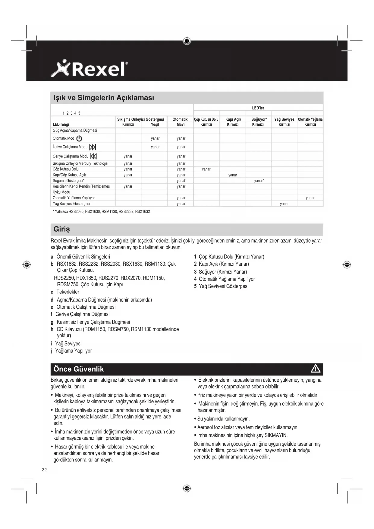 Óleo Rexel para destruidoras 176004932 Giriş Rexel Evrak İmha Makinesini seçtiğiniz için teşekkür ederiz. İşinizi çok iyi göreceğinden eminiz, ama makinenizden azami düzeyde yarar sağlayabilmek için lütfen biraz zaman ayırıp bu talimatları okuyun. a Önemli Güvenlik Simgeleri b RSX1632, RSS2232, RSS2030, RSX1630, RSM1130: Çek Çıkar Çöp Kutusu. RDS2250, RDX1850, RDS2270, RDX2070, RDM1150, RDSM750: Çöp Kutusu için Kapı c Tekerlekler d Açma/Kapama Düğmesi (makinenin arkasında) e Otomatik Çalıştırma Düğmesi f Geriye Çalıştırma Düğmesi g Kesintisiz İleriye Çalıştırma Düğmesi h CD Kılavuzu (RDM1150, RDSM750, RSM1130 modellerinde yoktur) i Yağ Seviyesi j Yağlama Yapılıyor 1 Çöp Kutusu Dolu (Kırmızı Yanar) 2 Kapı Açık (Kırmızı Yanar) 3 Soğuyor (Kırmızı Yanar) 4 Otomatik Yağlama Yapılıyor 5 Yağ Seviyesi Göstergesi ÖnceGüvenlik Birkaç güvenlik önlemini aldığınız taktirde evrak imha makineleri güvenle kullanılır.