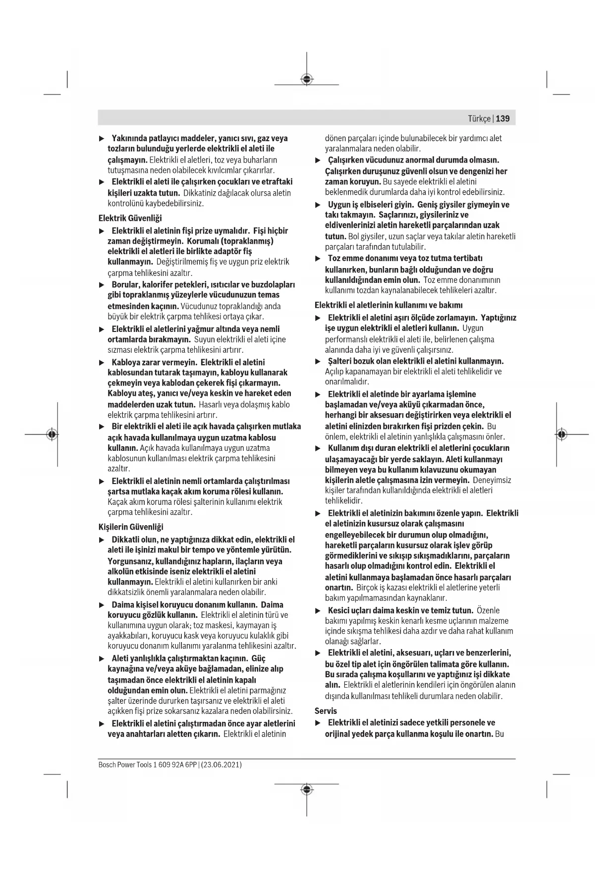 Τα ηλεκτρικά εργαλεία, τα εξαρτήματα και οι συσκευασίες πρέπει να ανακυκλώνονται με τρόπο φιλικό προς το περιβάλλον. Μην ρίχνετε τα ηλεκτρικά εργαλεία στα απορρίμματα του σπιτιού σας! Μόνο για χώρες τηςΕΕ: Σύμφωνα με την Ευρωπαϊκή Οδηγία 2012/19/ΕΕ σχετικά με τις παλιές ηλεκτρικές και ηλεκτρονικές συσκευές και τη μεταφορά της οδηγίας αυτής σε εθνικό δίκαιο δεν είναι πλέον υποχρεωτικό, τα άχρηστα ηλεκτρικά εργαλεία να συλλέγονται ξεχωριστά για να ανακυκλωθούν με τρόπο φιλικό προς το περιβάλλον. Türkçe Güvenlik talimatı Elektrikli El Aletleri İçin Genel Güvenlik Uyarıları UYARI Bütün güvenlik uyarılarını ve talimatları okuyun. Açıklanan uyarılara ve talimatlara uyulmadığı takdirde elektrik çarpmalarına, yangınlara ve/veya ağır yaralanmalara neden olunabilir. Bütün uyarıları ve talimatları ileride kullanmak üzere saklayın. Uyarı ve talimatlarda kullanılan "elektrikli el aleti" terimi, akım şebekesine bağlı (elektrikli) aletlerle akü ile çalışan aletleri (akülü) kapsamaktadır. Çalışma yeri güvenliği u Çalıştığınız yeri temiz tutun ve iyi aydınlatın. Dağınık veya karanlık alanlar kazalara davetiye çıkarır. 1 609 92A 6PP | (23.06.2021) Bosch Power ToolsTürkçe | 139 u Yakınında patlayıcı maddeler, yanıcı sıvı, gaz veya tozların bulunduğu yerlerde elektrikli el aleti ile çalışmayın. Elektrikli el aletleri, toz veya buharların tutuşmasına neden olabilecek kıvılcımlar çıkarırlar. u Elektrikli el aleti ile çalışırken çocukları ve etraftaki kişileri uzakta tutun. Dikkatiniz dağılacak olursa aletin kontrolünü kaybedebilirsiniz. Elektrik Güvenliği u Elektrikli el aletinin fişi prize uymalıdır. Fişi hiçbir zaman değiştirmeyin. Korumalı (topraklanmış) elektrikli el aletleri ile birlikte adaptör fiş kullanmayın. Değiştirilmemiş fiş ve uygun priz elektrik çarpma tehlikesini azaltır. u Borular, kalorifer petekleri, ısıtıcılar ve buzdolapları gibi topraklanmış yüzeylerle vücudunuzun temas etmesinden kaçının. Vücudunuz topraklandığı anda büyük bir elektrik çarpma tehlikesi ortaya çıkar. u Elektrikli el aletlerini yağmur altında veya nemli ortamlarda bırakmayın. Suyun elektrikli el aleti içine sızması elektrik çarpma tehlikesini artırır. u Kabloya zarar vermeyin. Elektrikli el aletini kablosundan tutarak taşımayın, kabloyu kullanarak çekmeyin veya kablodan çekerek fişi çıkarmayın. Kabloyu ateş, yanıcı ve/veya keskin ve hareket eden maddelerden uzak tutun. Hasarlı veya dolaşmış kablo elektrik çarpma tehlikesini artırır. u Bir elektrikli el aleti ile açık havada çalışırken mutlaka açık havada kullanılmaya uygun uzatma kablosu kullanın. Açık havada kullanılmaya uygun uzatma kablosunun kullanılması elektrik çarpma tehlikesini azaltır. u Elektrikli el aletinin nemli ortamlarda çalıştırılması şartsa mutlaka kaçak akım koruma rölesi kullanın. Kaçak akım koruma rölesi şalterinin kullanımı elektrik çarpma tehlikesini azaltır. Kişilerin Güvenliği u Dikkatli olun, ne yaptığınıza dikkat edin, elektrikli el aleti ile işinizi makul bir tempo ve yöntemle yürütün. Yorgunsanız, kullandığınız hapların, ilaçların veya alkolün etkisinde iseniz elektrikli el aletini kullanmayın. Elektrikli el aletini kullanırken bir anki dikkatsizlik önemli yaralanmalara neden olabilir. u Daima kişisel koruyucu donanım kullanın. Daima koruyucu gözlük kullanın. Elektrikli el aletinin türü ve kullanımına uygun olarak; toz maskesi, kaymayan iş ayakkabıları, koruyucu kask veya koruyucu kulaklık gibi koruyucu donanım kullanımı yaralanma tehlikesini azaltır. u Aleti yanlışlıkla çalıştırmaktan kaçının. Güç kaynağına ve/veya aküye bağlamadan, elinize alıp taşımadan önce elektrikli el aletinin kapalı olduğundan emin olun. Elektrikli el aletini parmağınız şalter üzerinde dururken taşırsanız ve elektrikli el aleti açıkken fişi prize sokarsanız kazalara neden olabilirsiniz. u Elektrikli el aletini çalıştırmadan önce ayar aletlerini veya anahtarları aletten çıkarın. Elektrikli el aletinin dönen parçaları içinde bulunabilecek bir yardımcı alet yaralanmalara neden olabilir. u Çalışırken vücudunuz anormal durumda olmasın. Çalışırken duruşunuz güvenli olsun ve dengenizi her zaman koruyun. Bu sayede elektrikli el aletini beklenmedik durumlarda daha iyi kontrol edebilirsiniz. u Uygun iş elbiseleri giyin. Geniş giysiler giymeyin ve takı takmayın. Saçlarınızı, giysileriniz ve eldivenlerinizi aletin hareketli parçalarından uzak tutun. Bol giysiler, uzun saçlar veya takılar aletin hareketli parçaları tarafından tutulabilir. u Toz emme donanımı veya toz tutma tertibatı kullanırken, bunların bağlı olduğundan ve doğru kullanıldığından emin olun. Toz emme donanımının kullanımı tozdan kaynalanabilecek tehlikeleri azaltır. Elektrikli el aletlerinin kullanımı ve bakımı u Elektrikli el aletini aşırı ölçüde zorlamayın. Yaptığınız işe uygun elektrikli el aletleri kullanın. Uygun performanslı elektrikli el aleti ile, belirlenen çalışma alanında daha iyi ve güvenli çalışırsınız. u Şalteri bozuk olan elektrikli el aletini kullanmayın. Açılıp kapanamayan bir elektrikli el aleti tehlikelidir ve onarılmalıdır. u Elektrikli el aletinde bir ayarlama işlemine başlamadan ve/veya aküyü çıkarmadan önce, herhangi bir aksesuarı değiştirirken veya elektrikli el aletini elinizden bırakırken fişi prizd