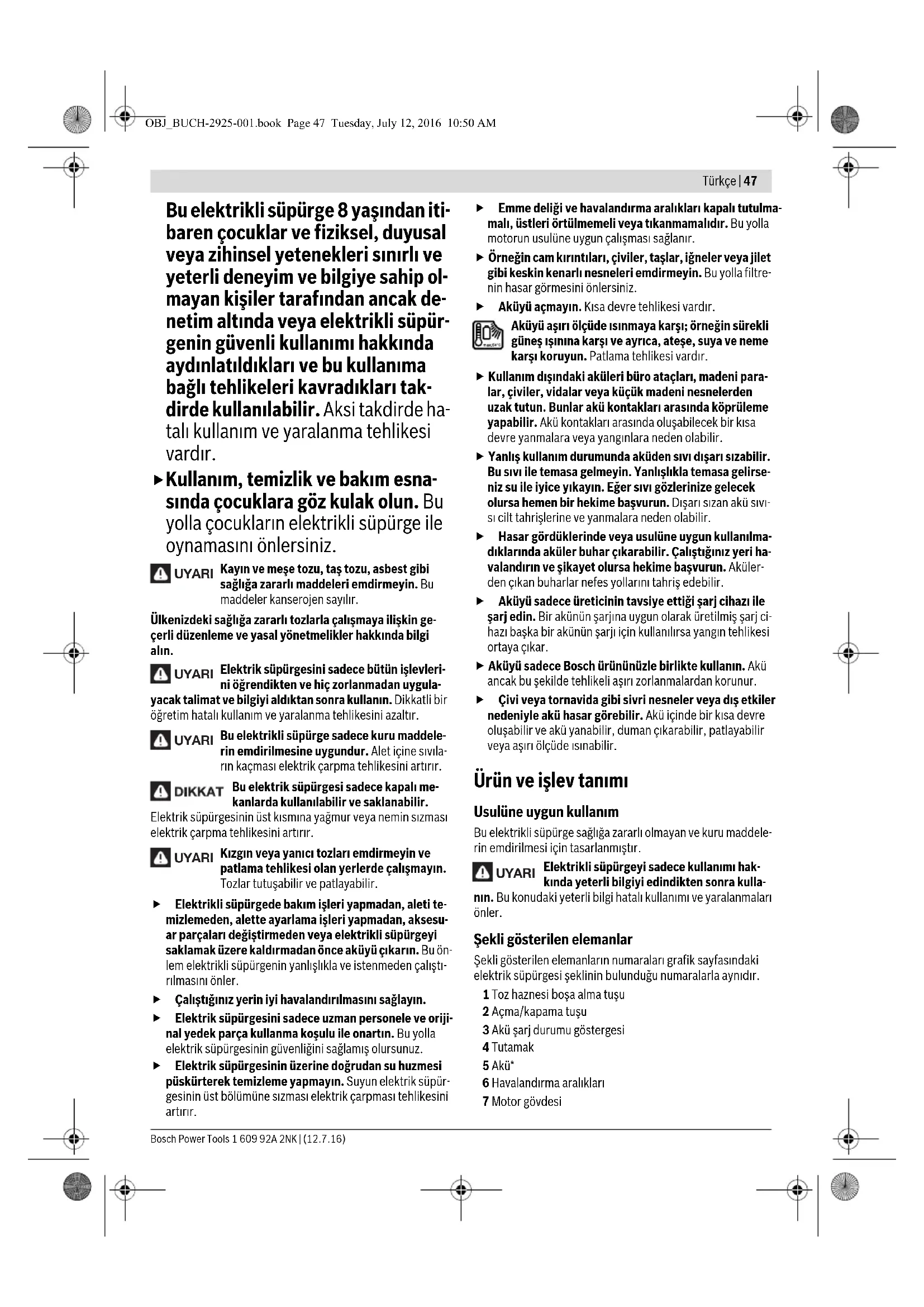 Μπαταρίες/Επαναφορτιζόμενες μπαταρίες: Li-Ion: Παρακαλούμε να δώσετε προσοχή στις υποδείξεις στο κεφάλαιο «Μεταφορά», σελίδα 46. Τηρούμε το δικαίωμα αλλαγών. Türkçe Güvenlik Talimatı Bütün uyarıları ve talimat hükümlerini oku- yun. Açıklanan uyarılara ve talimat hükümlerine uyulmadığı takdirde elektrik çarpmalarına, yan- gınlara ve/veya ağır yaralanmalara neden oluna- bilir. Bu talimatı iyi saklayın. Bu elektrikli süpürge, çocukların ve fiziksel, duyusal veya zihinsel yetekleri sınırlı veya yetersiz dene- yimi veya bilgisi olan kişiler tarafın- dan kullanımka üzere tasarlanma- mıştır. OBJ_BUCH-2925-001.book Page 46 Tuesday, July 12, 2016 10:50 AMTürkçe | 47 Bosch Power Tools 1 609 92A 2NK | (12.7.16) Bu elektrikli süpürge 8 yaşından iti- baren çocuklar ve fiziksel, duyusal veya zihinsel yetenekleri sınırlı ve yeterli deneyim ve bilgiye sahip ol- mayan kişiler tarafından ancak de- netim altında veya elektrikli süpür- genin güvenli kullanımı hakkında aydınlatıldıkları ve bu kullanıma bağlı tehlikeleri kavradıkları tak- dirde kullanılabilir. Aksi takdirde ha- talı kullanım ve yaralanma tehlikesi vardır. Kullanım, temizlik ve bakım esna- sında çocuklara göz kulak olun. Bu yolla çocukların elektrikli süpürge ile oynamasını önlersiniz. Kayın ve meşe tozu, taş tozu, asbest gibi sağlığa zararlı maddeleri emdirmeyin. Bu maddeler kanserojen sayılır. Ülkenizdeki sağlığa zararlı tozlarla çalışmaya ilişkin ge- çerli düzenleme ve yasal yönetmelikler hakkında bilgi alın. Elektrik süpürgesini sadece bütün işlevleri- ni öğrendikten ve hiç zorlanmadan uygula- yacak talimat ve bilgiyi aldıktan sonra kullanın. Dikkatli bir öğretim hatalı kullanım ve yaralanma tehlikesini azaltır. Bu elektrikli süpürge sadece kuru maddele- rin emdirilmesine uygundur. Alet içine sıvıla- rın kaçması elektrik çarpma tehlikesini artırır. Bu elektrik süpürgesi sadece kapalı me- kanlarda kullanılabilir ve saklanabilir. Elektrik süpürgesinin üst kısmına yağmur veya nemin sızması elektrik çarpma tehlikesini artırır. Kızgın veya yanıcı tozları emdirmeyin ve patlama tehlikesi olan yerlerde çalışmayın. Tozlar tutuşabilir ve patlayabilir. Elektrikli süpürgede bakım işleri yapmadan, aleti te- mizlemeden, alette ayarlama işleri yapmadan, aksesu- ar parçaları değiştirmeden veya elektrikli süpürgeyi saklamak üzere kaldırmadan önce aküyü çıkarın. Bu ön- lem elektrikli süpürgenin yanlışlıkla ve istenmeden çalıştı- rılmasını önler. Çalıştığınız yerin iyi havalandırılmasını sağlayın. Elektrik süpürgesini sadece uzman personele ve oriji- nal yedek parça kullanma koşulu ile onartın. Bu yolla elektrik süpürgesinin güvenliğini sağlamış olursunuz. Elektrik süpürgesinin üzerine doğrudan su huzmesi püskürterek temizleme yapmayın. Suyun elektrik süpür- gesinin üst bölümüne sızması elektrik çarpması tehlikesini artırır. Emme deliği ve havalandırma aralıkları kapalı tutulma- malı, üstleri örtülmemeli veya tıkanmamalıdır. Bu yolla motorun usulüne uygun çalışması sağlanır. Örneğin cam kırıntıları, çiviler, taşlar, iğneler veya jilet gibi keskin kenarlı nesneleri emdirmeyin. Bu yolla filtre- nin hasar görmesini önlersiniz. Aküyü açmayın. Kısa devre tehlikesi vardır. Aküyü aşırı ölçüde ısınmaya karşı; örneğin sürekli güneş ışınına karşı ve ayrıca, ateşe, suya ve neme karşı koruyun. Patlama tehlikesi vardır. Kullanım dışındaki aküleri büro ataçları, madeni para- lar, çiviler, vidalar veya küçük madeni nesnelerden uzak tutun. Bunlar akü kontakları arasında köprüleme yapabilir. Akü kontakları arasında oluşabilecek bir kısa devre yanmalara veya yangınlara neden olabilir. Yanlış kullanım durumunda aküden sıvı dışarı sızabilir. Bu sıvı ile temasa gelmeyin. Yanlışlıkla temasa gelirse- niz su ile iyice yıkayın. Eğer sıvı gözlerinize gelecek olursa hemen bir hekime başvurun. Dışarı sızan akü sıvı- sı cilt tahrişlerine ve yanmalara neden olabilir. Hasar gördüklerinde veya usulüne uygun kullanılma- dıklarında aküler buhar çıkarabilir. Çalıştığınız yeri ha- valandırın ve şikayet olursa hekime başvurun. Aküler- den çıkan buharlar nefes yollarını tahriş edebilir. Aküyü sadece üreticinin tavsiye ettiği şarj cihazı ile şarj edin. Bir akünün şarjına uygun olarak üretilmiş şarj ci- hazı başka bir akünün şarjı için kullanılırsa yangın tehlikesi ortaya çıkar. Aküyü sadece Bosch ürününüzle birlikte kullanın. Akü ancak bu şekilde tehlikeli aşırı zorlanmalardan korunur. Çivi veya tornavida gibi sivri nesneler veya dış etkiler nedeniyle akü hasar görebilir. A kü içinde bir kısa devre oluşabilir ve akü yanabilir, duman çıkarabilir, patlayabilir veya aşırı ölçüde ısınabilir. Ürün ve işlev tanımı Usulüne uygun kullanım Bu elektrikli süpürge sağlığa zararlı olmayan ve kuru maddele- rin emdirilmesi için tasarlanmıştır. Elektrikli süpürgeyi sadece kullanımı hak- kında yeterli bilgiyi edindikten sonra kulla- nın. Bu konudaki yeterli bilgi hatalı kullanımı ve yaralanmaları önler. Şekli gösterilen elemanlar Şekli gösterilen elemanların numaraları grafik sayfasındaki elektrik süpürgesi şeklinin bulunduğu numaralarla aynıdır. 1 Toz haznesi boşa alma tuşu 2 Açma/kapama tuşu 3 Akü şarj durumu göstergesi 4 Tutamak 5 Akü* 6 Havalandırma aralıkları 7 Motor gövdesi UYARI UYARI UYARI UYARI UYARI OBJ_BUCH-2925-001.book Page 47 Tuesday, July 12, 2016 10:50 AM48 | Türkçe 1 609 92A 2NK | (12.7.16) Bosch Power Tools 8 Toz haznesi 9 Derz memesi 10 Emme deliği 11 Akü yuvası 12 Akü boşa alma dü