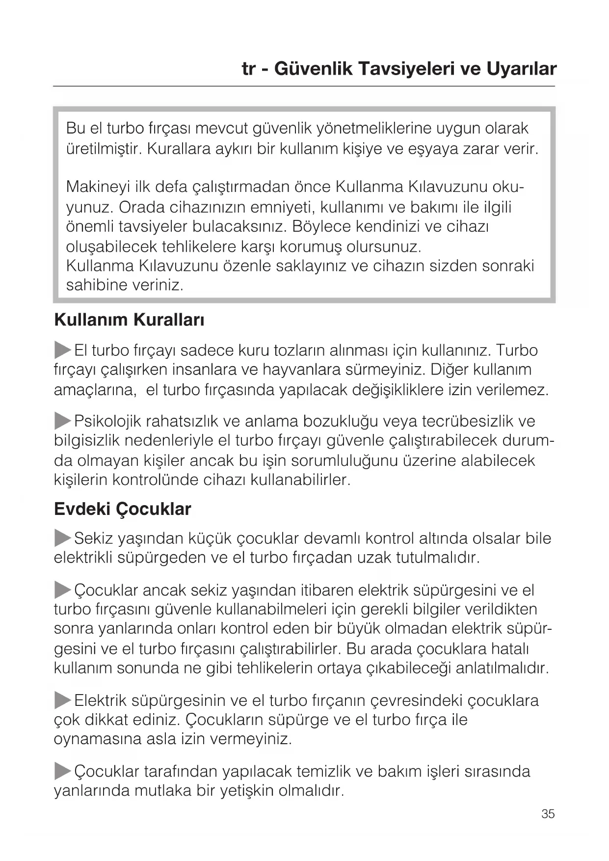 34Bu el turbo fýrçasý mevcut güvenlik yönetmeliklerine uygun olarak üretilmiþtir. Kurallara aykýrý bir kullaným kiþiye ve eþyaya zarar verir. Makineyi ilk defa çalýþtýrmadan önce Kullanma Kýlavuzunu oku- yunuz. Orada cihazýnýzýn emniyeti, kullanýmý ve bakýmý ile ilgili önemli tavsiyeler bulacaksýnýz. Böylece kendinizi ve cihazý oluþabilecek tehlikelere karþý korumuþ olursunuz. Kullanma Kýlavuzunu özenle saklayýnýz ve cihazýn sizden sonraki sahibine veriniz. Kullaným Kurallarý