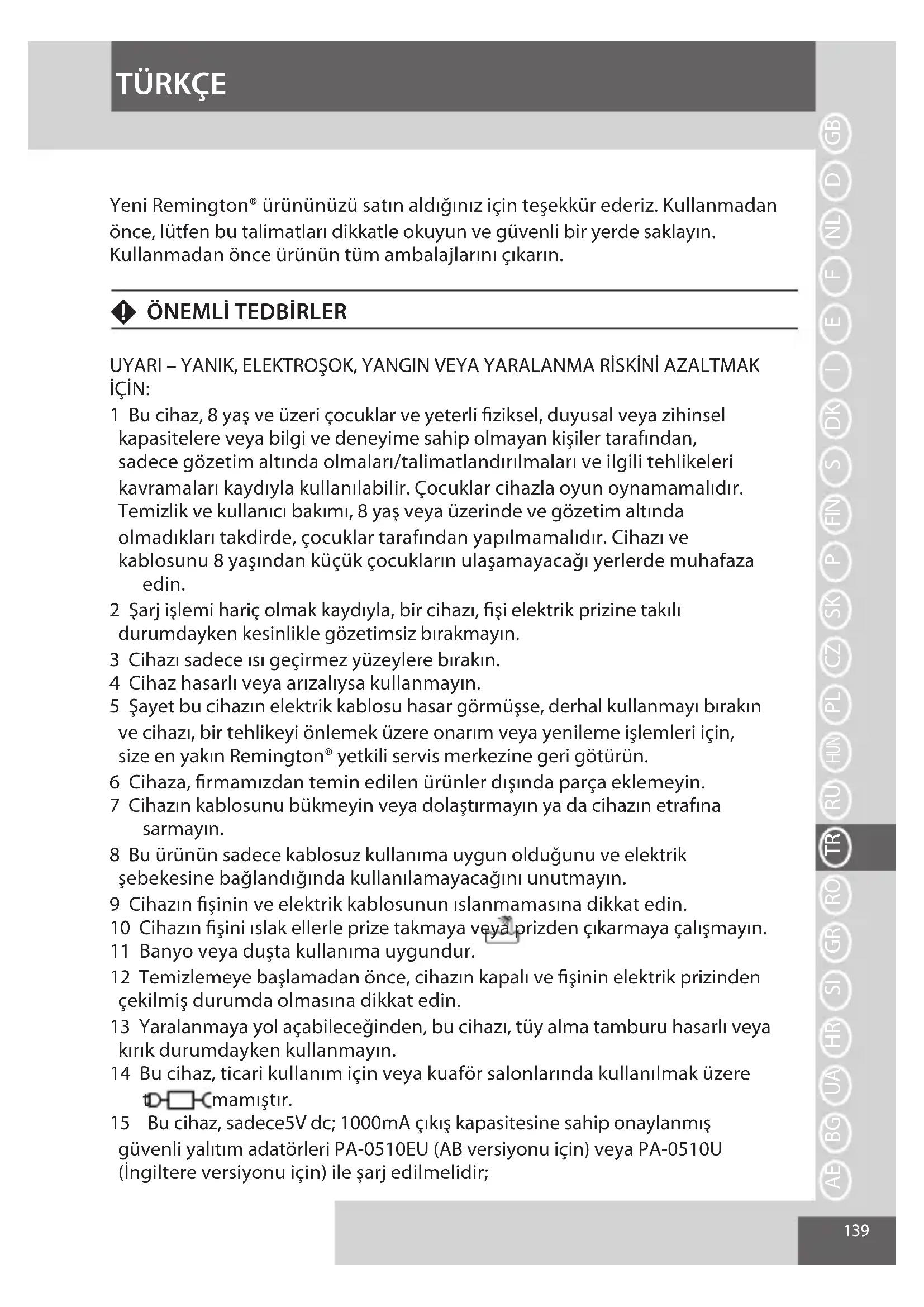 UYARI – YANIK, ELEKTROŞOK, YANGIN VEYA YARALANMA RİSKİNİ AZALTMAK İÇİN: 1 Bu cihaz, 8 yaş ve üzeri çocuklar ve yeterli fiziksel, duyusal veya zihinsel kapasitelere veya bilgi ve deneyime sahip olmayan kişiler tarafından, sadece gözetim altında olmaları/talimatlandırılmaları ve ilgili tehlikeleri kavramaları kaydıyla kullanılabilir. Çocuklar cihazla oyun oynamamalıdır. Temizlik ve kullanıcı bakımı, 8 yaş veya üzerinde ve gözetim altında olmadıkları takdirde, çocuklar tarafından yapılmamalıdır. Cihazı ve kablosunu 8 yaşından küçük çocukların ulaşamayacağı yerlerde muhafaza edin. 2 Şarj işlemi hariç olmak kaydıyla, bir cihazı, fişi elektrik prizine takılı durumdayken kesinlikle gözetimsiz bırakmayın. 3 Cihazı sadece ısı geçirmez yüzeylere bırakın. 4 Cihaz hasarlı veya arızalıysa kullanmayın. 5 Şayet bu cihazın elektrik kablosu hasar görmüşse, derhal kullanmayı bırakın ve cihazı, bir tehlikeyi önlemek üzere onarım veya yenileme işlemleri için, size en yakın Remington® yetkili servis merkezine geri götürün. 6 Cihaza, firmamızdan temin edilen ürünler dışında parça eklemeyin. 7 Cihazın kablosunu bükmeyin veya dolaştırmayın ya da cihazın etrafına sarmayın. 8 Bu ürünün sadece kablosuz kullanıma uygun olduğunu ve elektrik şebekesine bağlandığında kullanılamayacağını unutmayın. 9 Cihazın fişinin ve elektrik kablosunun ıslanmamasına dikkat edin. 10 Cihazın fişini ıslak ellerle prize takmaya veya prizden çıkarmaya çalışmayın. 11 Banyo veya duşta kullanıma uygundur. 12 Temizlemeye başlamadan önce, cihazın kapalı ve fişinin elektrik prizinden çekilmiş durumda olmasına dikkat edin. 13 Yaralanmaya yol açabileceğinden, bu cihazı, tüy alma tamburu hasarlı veya kırık durumdayken kullanmayın. 14 Bu cihaz, ticari kullanım için veya kuaför salonlarında kullanılmak üzere tasarlanmamıştır. 15 Bu cihaz, sadece5V dc; 1000mA çıkış kapasitesine sahip onaylanmış güvenli yalıtım adatörleri PA-0510EU (AB versiyonu için) veya PA-0510U (İngiltere versiyonu için) ile şarj edilmelidir;