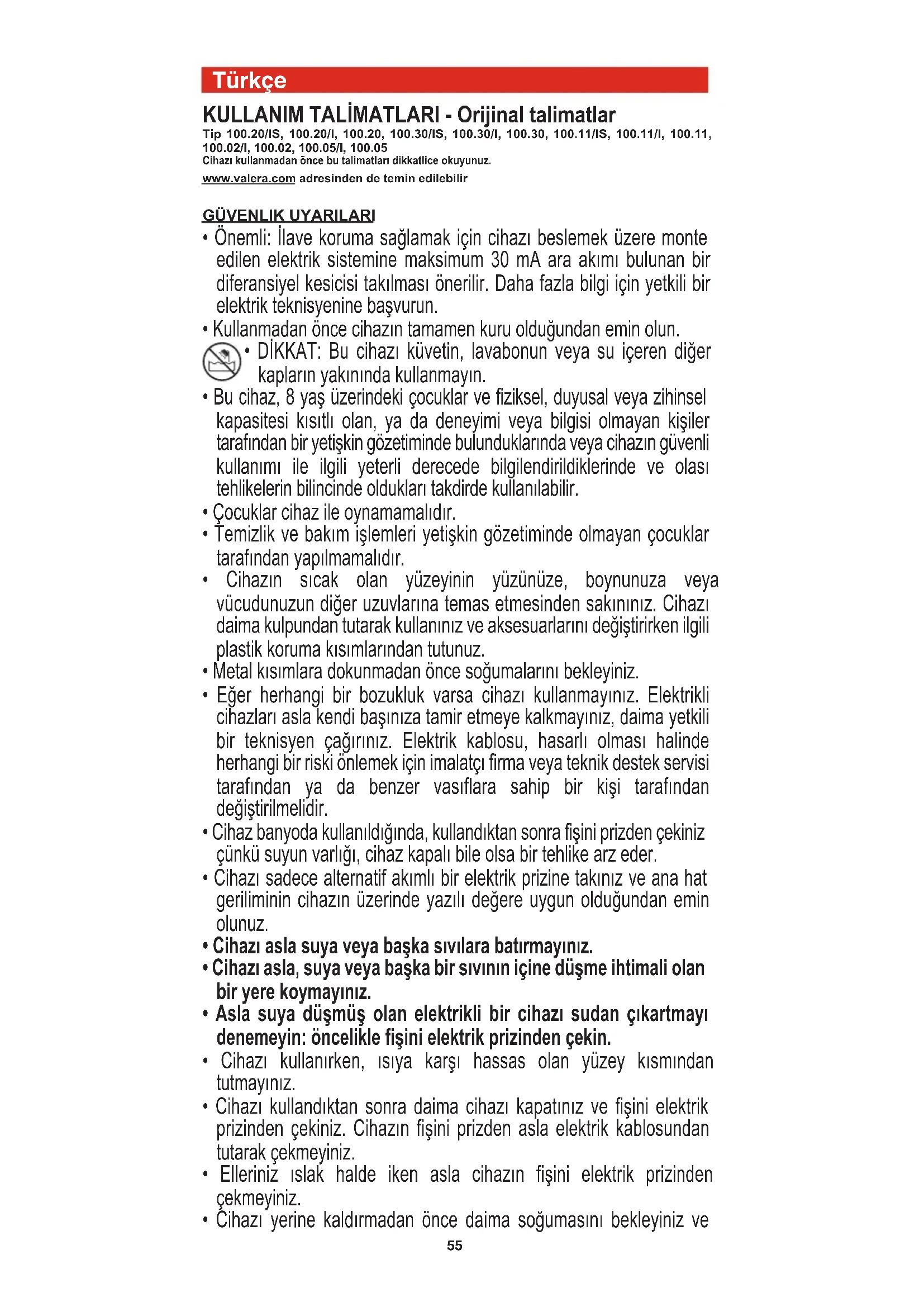 şekillendirme işlemini sabitlemek için halihazırda sıcak olan saçları okşayarak kütikülü kapatır ve fazla sıcaklığı alır. VALERA tescilli bir Ligo Electric S.A Isviçre markasıdır. Ürünün yada ambalajının üzerindeki simgesi, bu ürünün normal ev çöpü gibi atılmayıp, elektrik ve elektronik cihazların geri dönüşüm için verildiği özel toplama noktalarından birine verilmesi gerektiğini belirtir. Bu ürünün doğru şekilde imha edilmesine katkıda bulunmakla hem çevreyi, hem de çevredekilerin sağlığını korumuş olursunuz. Yanlış şekilde imha ise hem çevreye hem de sağlığa zararlıdır. Bu ürünün geri dönüşümüne ilişkin daha ayrıntılı bilgileri belediyenizden, çöp dairenizden veya ürünü satın almış olduğunuz satıcıdan edinebilirsiniz. 00060714 int_mar2017:Layout 1 07/03/2017 9.20 Pagina 57ʹʮʺʹʮʬ ʪʩʸʣʮ - ʺʥʩʸʥʷʮ ʺʥʠʸʥʤ ʭʩʮʢʣ 100.20/IS, 100.20/I, 100.20, 100.30/IS, 100.30/I, 100.30, 100.11/IS, 100.11/I, 100.11, 100.02/I, 100.02, 100.05/I, 100.05 ʺʥʠʸʥʤʤ ʺʠ ʯʥʩʲʡ ʠʥʸʷʬ ʠʰ ,ʸʩʹʫʮʡ ʹʥʮʩʹʤ ʩʰʴʬ . ʥʰʬʹ ʨʰʸʨʰʩʠʤ ʸʺʠʡ ʭʢ ʺʥʰʩʮʦ ʺʥʠʸʥʤʤa.comwww.valer ʺʥʧʩʨʡ ʺʥʸʤʦʠ
