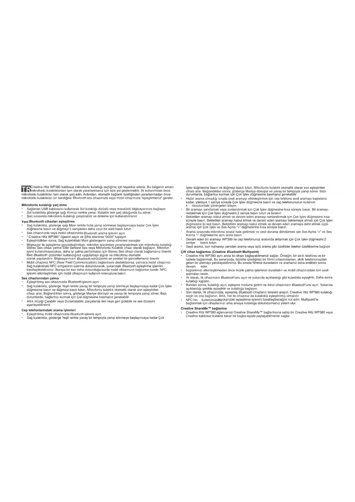 - Creative Hitz WP380 kulaklık bağlantısı veya pil düzeyi durumu konusunda sesli göstergeler sağlar. Pil düzeyi durumunu öğrenmek için Çoklu İşlev düğmesine iki kez basın (sesli aramalar sı rasında çalışmaz).