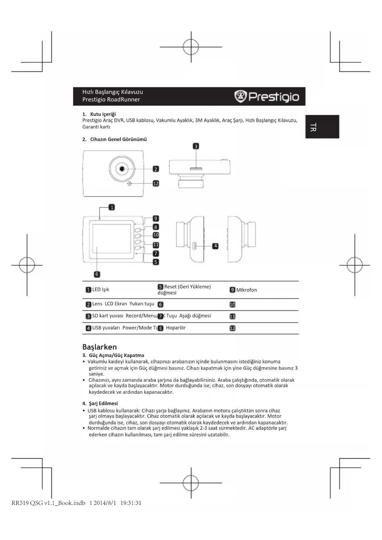 - Normalde cihazın tam olarak şarj edilmesi yaklaşık 2-3 saat sürmektedir. AC adaptörle şarj ederken cihazın kullanılması, tam şarj edilme süresini uzatabilir. RR519 QSG v1.1_Book.indb 1 2014/8/1 19:31:31Hızlı Başlangıç Kılavuzu Prestigio RoadRunner