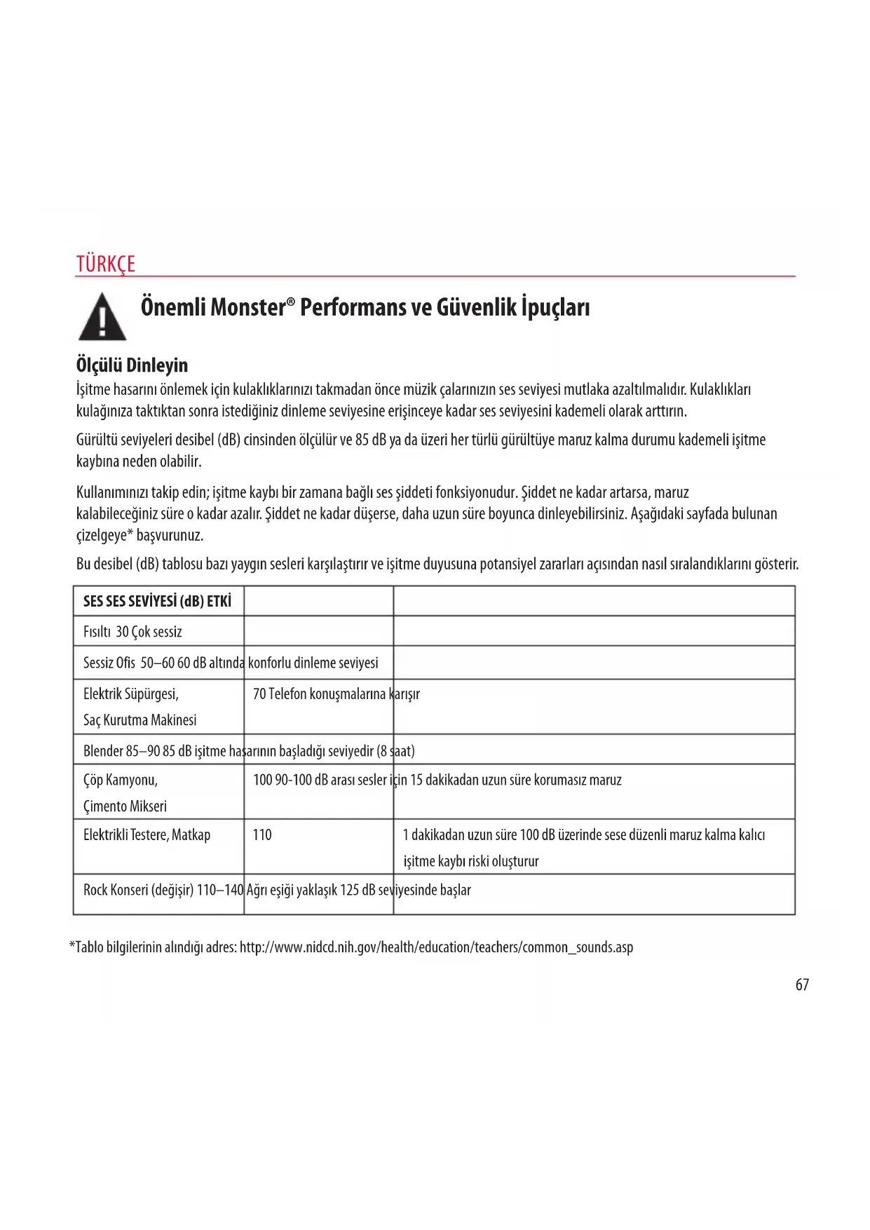 66Ölçülü Dinleyin İşitme hasarını önlemek için kulaklıklarınızı takmadan önce müzik çalarınızın ses seviyesi mutlaka azaltılmalıdır. Kulaklıkları kulağınıza taktıktan sonra istediğiniz dinleme seviyesine erişinceye kadar ses seviyesini kademeli olarak arttırın. Gürültü seviyeleri desibel (dB) cinsinden ölçülür ve 85 dB ya da üzeri her türlü gürültüye maruz kalma durumu kademeli işitme kaybına neden olabilir. Kullanımınızı takip edin; işitme kaybı bir zamana bağlı ses şiddeti fonksiyonudur. Şiddet ne kadar artarsa, maruz kalabileceğiniz süre o kadar azalır. Şiddet ne kadar düşerse, daha uzun süre boyunca dinleyebilirsiniz. Aşağıdaki sayfada bulunan çizelgeye* başvurunuz. Bu desibel (dB) tablosu bazı yaygın sesleri karşılaştırır ve işitme duyusuna potansiyel zararları açısından nasıl sıralandıklarını gösterir. Önemli Monster® Performans ve Güvenlik İpuçları SES SES SEVİYESİ (dB) ETKİ Fısıltı 30 Çok sessiz Sessiz Ofis 50–60 60 dB altında konforlu dinleme seviyesi Elektrik Süpürgesi, Saç Kurutma Makinesi 70 Telefon konuşmalarına karışır Blender 85–90 85 dB işitme hasarının başladığı seviyedir (8 saat) Çöp Kamyonu, Çimento Mikseri 100 90-100 dB arası sesler için 15 dakikadan uzun süre korumasız maruz Elektrikli Testere, Matkap 110 1 dakikadan uzun süre 100 dB üzerinde sese düzenli maruz kalma kalıcı işitme kaybı riski oluşturur Rock Konseri (değişir) 110–140 Ağrı eşiği yaklaşık 125 dB seviyesinde başlar *Tablo bilgilerinin alındığı adres: http://www.nidcd.nih.gov/health/education/teachers/common_sounds.asp