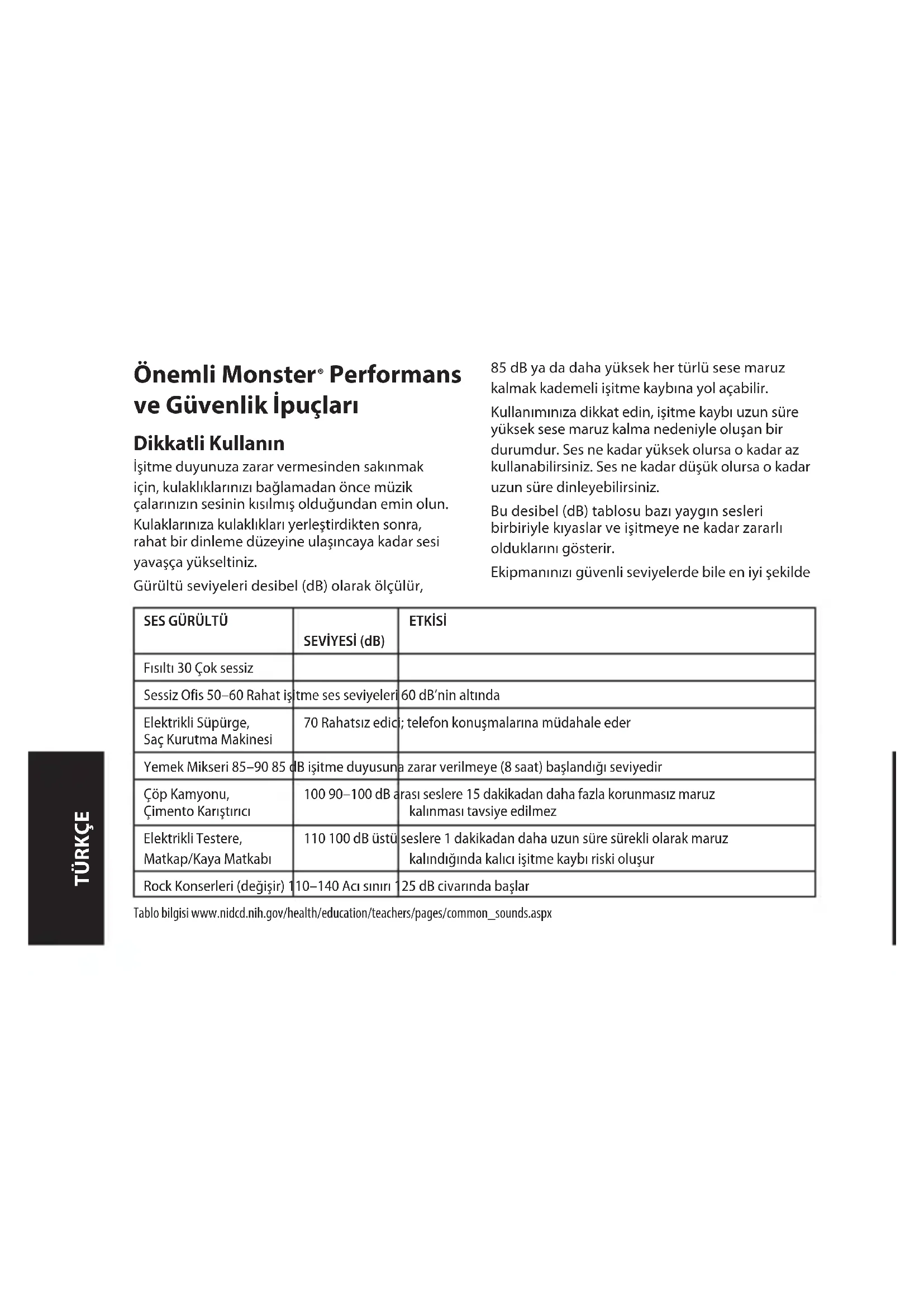 SEVİYESİ (dB) ETKİSİ Fısıltı 30 Çok sessiz Sessiz Ofis 50–60 Rahat işitme ses seviyeleri 60 dB’nin altında Elektrikli Süpürge, Saç Kurutma Makinesi 70 Rahatsız edici; telefon konuşmalarına müdahale eder Yemek Mikseri 85–90 85 dB işitme duyusuna zarar verilmeye (8 saat) başlandığı seviyedir Çöp Kamyonu, Çimento Karıştırıcı 100 90–100 dB arası seslere 15 dakikadan daha fazla korunmasız maruz kalınması tavsiye edilmez Elektrikli Testere, Matkap/Kaya Matkabı 110 100 dB üstü seslere 1 dakikadan daha uzun süre sürekli olarak maruz kalındığında kalıcı işitme kaybı riski oluşur Rock Konserleri (değişir) 110–140 Acı sınırı 125 dB civarında başlar Tablo bilgisi www.nidcd.nih.gov/health/education/teachers/pages/common_sounds.aspx TÜRKÇEkullanın ve harika ses performansının tadını çıkarın. Kulaklıklarımız kısık seslerde hiç olmadığı kadar daha çok ayrıntı duymanızı sağlayacaktır. Güvenli bir dinleme seviyesi saptamayı öğrenmek ve diğer önemli güvenlik esasları için Tüketici Elektronikleri Derneğinin www.ce.org adresine bakın. Gürültü Kaynaklı İşitme Kaybını (HIHL) önlemek konusunda önemli bilgiler ve hangi seslerin zarar verebileceğine dair kapsamlı bir liste Sağırlık Araştırma Vakfı’nın www.drf.org adresinde bulunabilir. Kulak ve İşitme Fizyolojisi Yüksek sesin kulağınıza neler yapabileceğine dair ek bilgi ve tablo referansı için www.abelard.org/hear/hear.php#loud-music Dikkatli Kullanın Güvenli olmayan durumlarda kulaklıklarınızı kullanmayın – araç kullanırken, bisiklet sürerken, yoldan geçerken ya da etrafınızdakilere tam dikkatinizi vermenizi gerektiren bir etkinlik ortamındayken. Araç kullanırken kulaklık kullanmak tehlikeli ve bazı yerlerde yasaktır, çünkü diğer aracın kornası ya da acil durum araçlarının sirenleri gibi aracınızın dışındaki hayat kurtaran sesleri işitmenizi engeller. Lütfen araç kullanırken kulaklıklarınızı kullanmayın. Mobil medya cihazlarınızı dinlemek için Monster FM vericilerinden birini kullanın. Kulaklıkların “Rodajı” Kulaklıkların rodaj süresi mi olur? Şaka yapıyoruz sanıyorsunuz değil mi? Hayır, yapmıyoruz. İster otomobil isterse kulaklık olsun tüm diğer yüksek performans ürünleri gibi bu kulaklıklar da kullandıkça iyileşen mekanik cihazlardır. Yeni kulaklıklarınız paketinden çıktığında inanılmaz performans sergileyecektir ama kullandıkça “oturacak” ve daha da iyi ses verecektir. 8 saat kullanmanızı tavsiye ediyoruz. 20 saatlik kullanımdan sonra rodaj süresi tamamlanmış olacaktır. Keyfini çıkarın. Pil Eğer mümkünse pillerin geri dönüşümü sağlanmalı ya da uygun bir şekilde elden çıkarılmalıdır. Çekiç Kemiği Koklear Sinir Üzengi Kemiği Kulak Zarı İşitme Kanalı Koklea Örs Kemiği Vestibül Burna/Boğaza Gider TÜRKÇEMonster