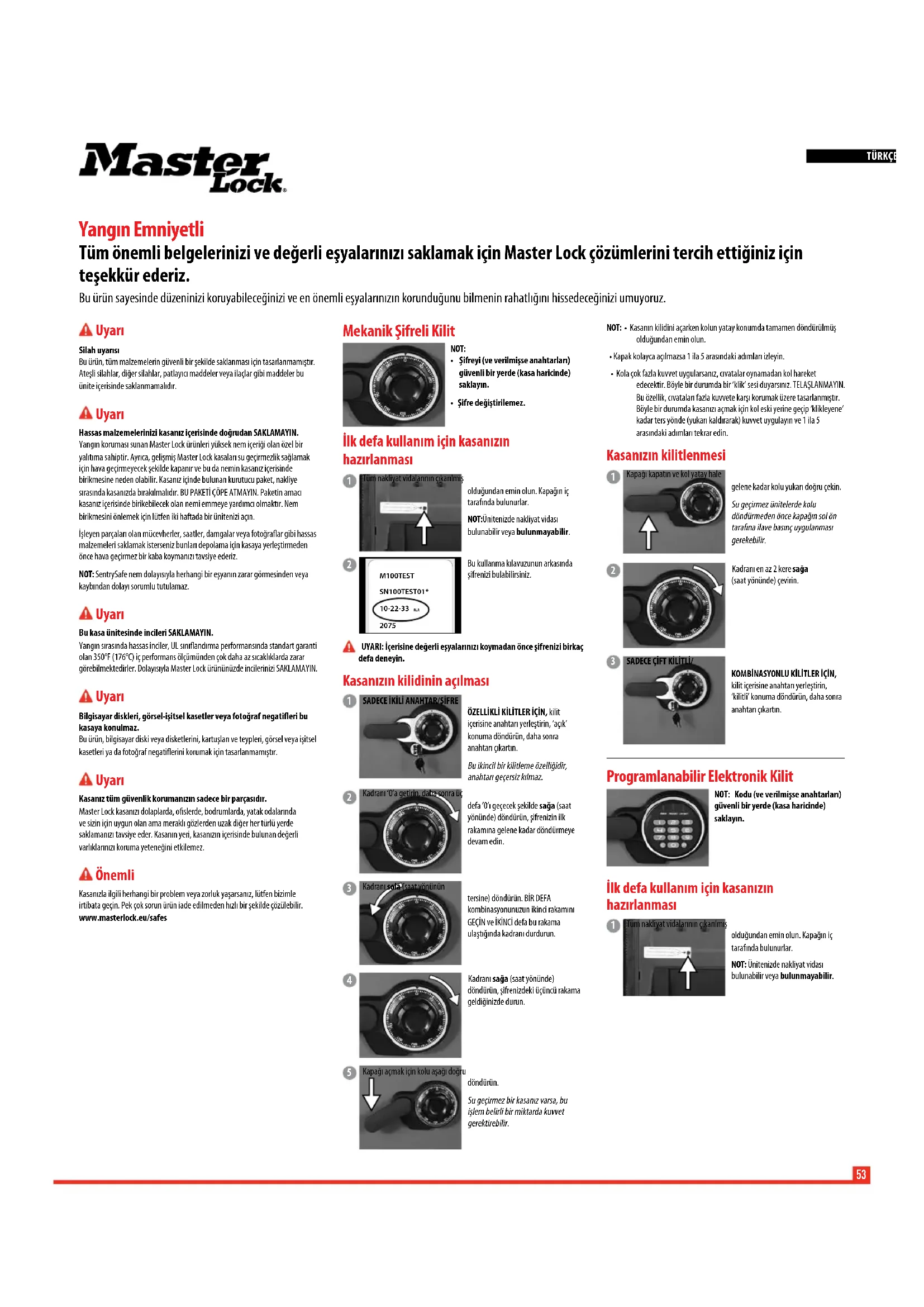 Tüm nakliyat vidalarının çıkarılmış olduğundan emin olun. Kapağın iç tarafında bulunurlar.NOT: Ünitenizde nakliyat vidası bulunabilir veya bulunmayabilir. Yangın Emniyetli Tüm önemli belgelerinizi ve değerli eşyalarınızı saklamak için Master Lock çözümlerini tercih ettiğiniz için teşekkür ederiz. Bu ürün sayesinde düzeninizi koruyabileceğinizi ve en önemli eşyalarınızın korunduğunu bilmenin rahatlığını hissedeceğinizi umuyoruz. Uyarı Silah uyarısıBu ürün, tüm malzemelerin güvenli bir şekilde saklanması için tasarlanmamıştır. Ateşli silahlar, diğer silahlar, patlayıcı maddeler veya ilaçlar gibi maddeler bu ünite içerisinde saklanmamalıdır. Uyarı Hassas malzemelerinizi kasanız içerisinde doğrudan SAKLAMAYIN.Yangın koruması sunan Master Lock ürünleri yüksek nem içeriği olan özel bir yalıtıma sahiptir. Ayrıca, gelişmiş Master Lock kasaları su geçirmezlik sağlamak için hava geçirmeyecek şekilde kapanır ve bu da nemin kasanız içerisinde birikmesine neden olabilir. Kasanız içinde bulunan kurutucu paket, nakliye sırasında kasanızda bırakılmalıdır. BU PAKETİ ÇÖPE ATMAYIN. Paketin amacı kasanız içerisinde birikebilecek olan nemi emmeye yardımcı olmaktır. Nem birikmesini önlemek için lütfen iki haftada bir ünitenizi açın.İşleyen parçaları olan mücevherler, saatler, damgalar veya fotoğraar gibi hassas malzemeleri saklamak isterseniz bunları depolama için kasaya yerleştirmeden önce hava geçirmez bir kaba koymanızı tavsiye ederiz.NOT: SentrySafe nem dolayısıyla herhangi bir eşyanın zarar görmesinden veya kaybından dolayı sorumlu tutulamaz. Uyarı Bu kasa ünitesinde incileri SAKLAMAYIN.Yangın sırasında hassas inciler, UL sınıandırma performansında standart garanti olan 350°F (176°C) iç performans ölçümünden çok daha az sıcaklıklarda zarar görebilmektedirler. Dolayısıyla Master Lock ürününüzde incilerinizi SAKLAMAYIN. Uyarı Bilgisayar diskleri, görsel-işitsel kasetler veya fotoğraf negatieri bu kasaya konulmaz.Bu ürün, bilgisayar diski veya disketlerini, kartuşları ve teypleri, görsel veya işitsel kasetleri ya da fotoğraf negatierini korumak için tasarlanmamıştır. Uyarı Kasanız tüm güvenlik korumanızın sadece bir parçasıdır.Master Lock kasanızı dolaplarda, oslerde, bodrumlarda, yatak odalarında ve sizin için uygun olan ama meraklı gözlerden uzak diğer her türlü yerde saklamanızı tavsiye eder. Kasanın yeri, kasanızın içerisinde bulunan değerli varlıklarınızı koruma yeteneğini etkilemez. Önemli Kasanızla ilgili herhangi bir problem veya zorluk yaşarsanız, lütfen bizimle irtibata geçin. Pek çok sorun ürün iade edilmeden hızlı bir şekilde çözülebilir. www.masterlock.eu/safes Mekanik Şifreli Kilit NOT: • Şifreyi (ve verilmişse anahtarları) güvenli bir yerde (kasa haricinde) saklayın.• Şifre değiştirilemez. İlk defa kullanım için kasanızın hazırlanması