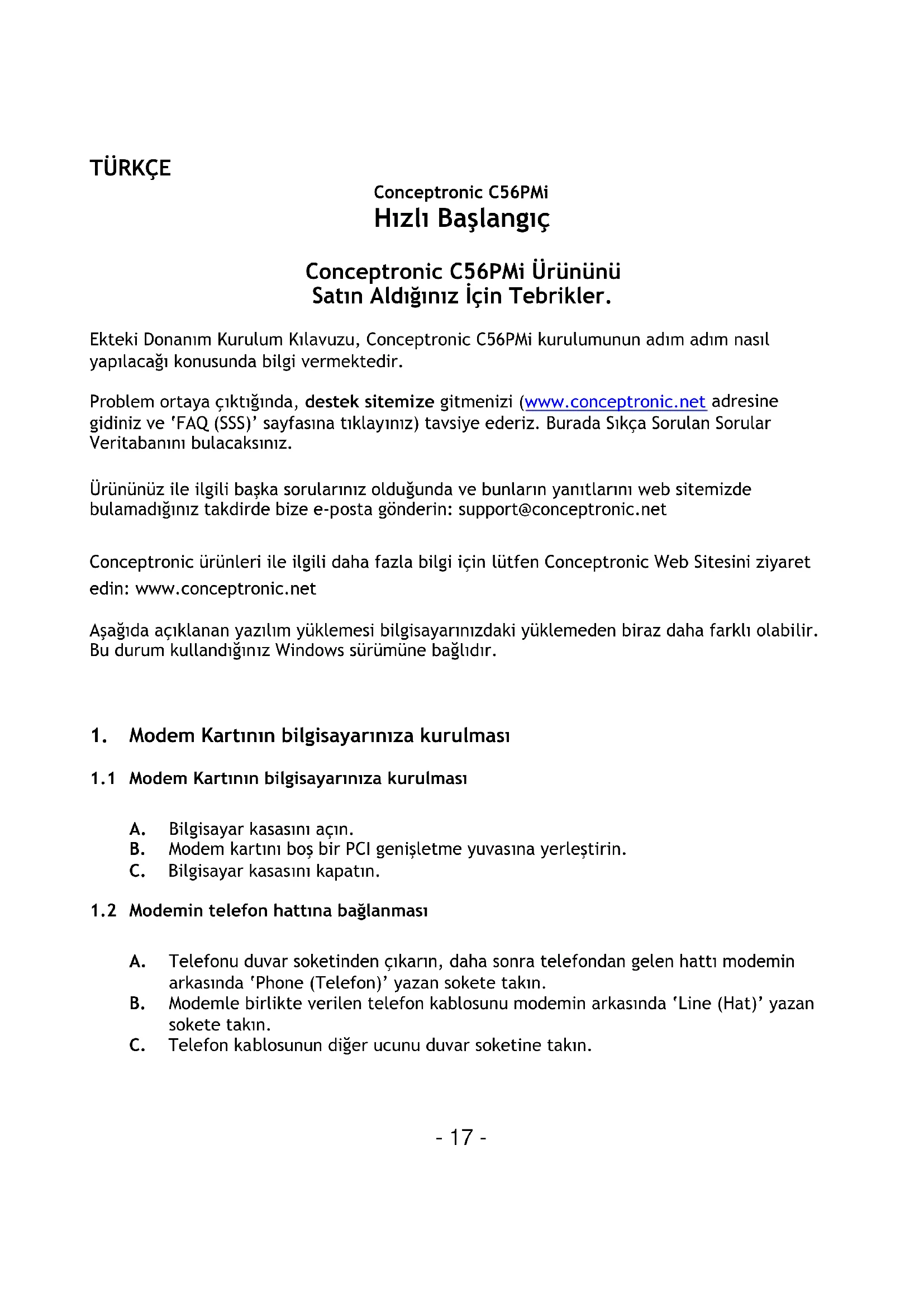 Problem ortaya çıktığında, destek sitemize gitmenizi (www.conceptronic.net adresine gidiniz ve ‘FAQ (SSS)’ sayfasına tıklayınız) tavsiye ederiz. Burada Sıkça Sorulan Sorular Veritabanını bulacaksınız. Ürününüz ile ilgili başka sorularınız olduğunda ve bunların yanıtlarını web sitemizde bulamadığınız takdirde bize e-posta gönderin: support@conceptronic.net Conceptronic ürünleri ile ilgili daha fazla bilgi için lütfen Conceptronic Web Sitesini ziyaret edin: www.conceptronic.net Aşağıda açıklanan yazılım yüklemesi bilgisayarınızdaki yüklemeden biraz daha farklı olabilir. Bu durum kullandığınız Windows sürümüne bağlıdır.