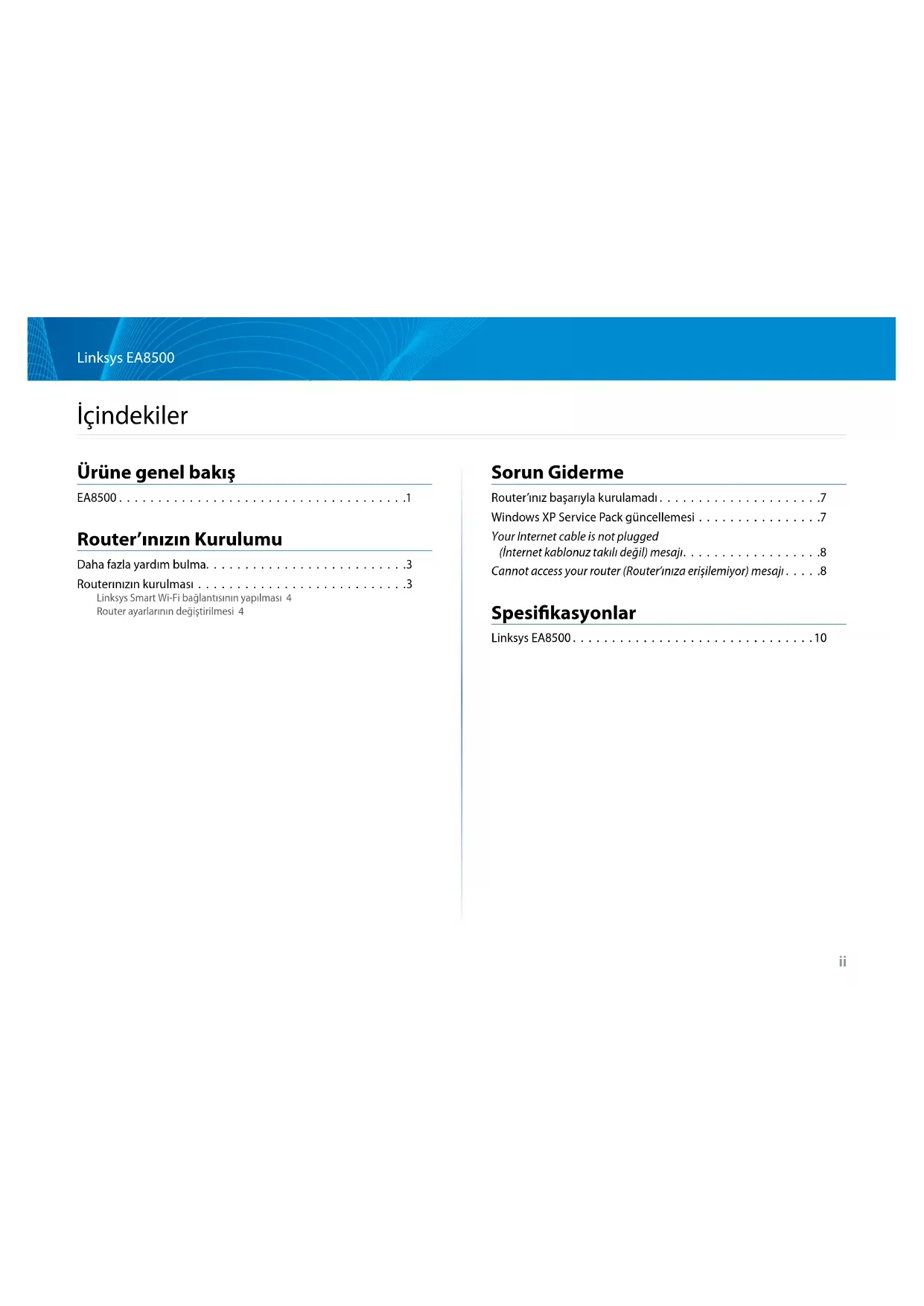- Linksys Smart Wi-Fi bağlantısının yapılması 4 Router ayarlarının değiştirilmesi 4 Sorun Giderme Router’ınız başarıyla kurulamadı p. 7