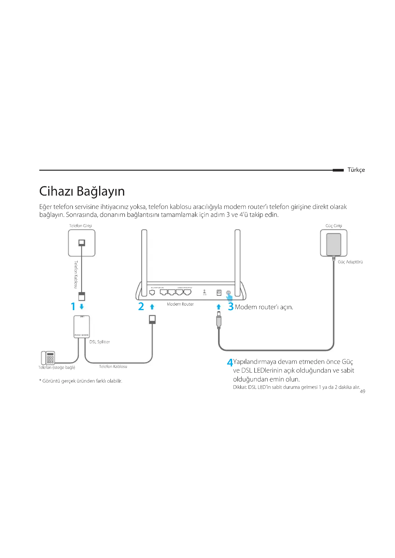 WPS/ RESETLAN3 LAN4/WAN WIFI Power* Görüntü gerçek üründen farklı olabilir.Dikkat: DSL LED’in sabit duruma gelmesi 1 ya da 2 dakika alır. Yapılandırmaya devam etmeden önce Güç ve DSL LEDlerinin açık olduğundan ve sabit olduğundan emin olun. Telefon GirişiTelefon KablosuTelefon KablosuModem Router Modem router’ı açın. Güç GirişiGüç AdaptörüDSL SplitterTelefon (isteğe bağlı)Türkçe