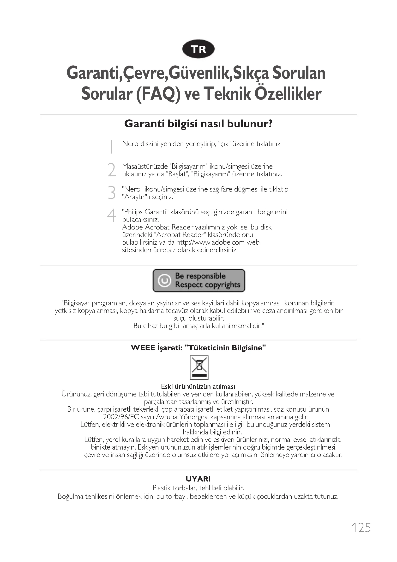 "Philips Garanti" klasörünü seçtiğinizde garanti belgelerini bulacaksınız. Adobe Acrobat Reader yazılımınız yok ise, bu disk üzerindeki "Acrobat Reader" klasöründe onu bulabilirsiniz ya da http://www.adobe.com web sitesinden ücretsiz olarak edinebilirsiniz. "Bilgisayar programlari, dosyalar, yayimlar ve ses kayitlari dahil kopyalanmasi korunan bilgilerin yetkisiz kopyalanmasi, kopya haklarna tecavüz olarak kabul edilebilir ve cezalandirilmasi gereken bir suçu olusturabilir. Bu cihaz bu gibi amaçlarla kullanilmamalidir." WEEE İşareti: "Tüketicinin Bilgisine" Eski ürününüzün atılması Ürününüz, geri dönüşüme tabi tutulabilen ve yeniden kullanılabilen, yüksek kalitede malzeme ve parçalardan tasarlanmış ve üretilmiştir. Bir ürüne, çarpı işaretli tekerlekli çöp arabası işaretli etiket yapıştırılması, söz konusu ürünün 2002/96/EC sayılı Avrupa Yönergesi kapsamına alınması anlamına gelir. Lütfen, elektrikli ve elektronik ürünlerin toplanması ile ilgili bulunduğunuz yerdeki sistem hakkında bilgi edinin. Lütfen, yerel kurallara uygun hareket edin ve eskiyen ürünlerinizi, normal evsel atıklarınızla birlikte atmayın. Eskiyen ürününüzün atık işlemlerinin doğru biçimde gerçekleştirilmesi, çevre ve insan sağlığı üzerinde olumsuz etkilere yol açılmasını önlemeye yardımcı olacaktır. UYARI Plastik torbalar, tehlikeli olabilir. Boğulma tehlikesini önlemek için, bu torbayı, bebeklerden ve küçük çocuklardan uzakta tutunuz. Garanti,Çevre,Güvenlik,Sıkça Sorulan Sorular (FAQ) ve Teknik Özellikler TR126 Sıkça Sorulan Sorular (FAQ) Soru 1: Windows 98 Second Edition (İkinci Sürüm) PC’im ve bilgisayarımda CDROM aygıtı yok ancak bir başka PC’im var. Sürücülerin kurulumunu nasıl yapabilirim?