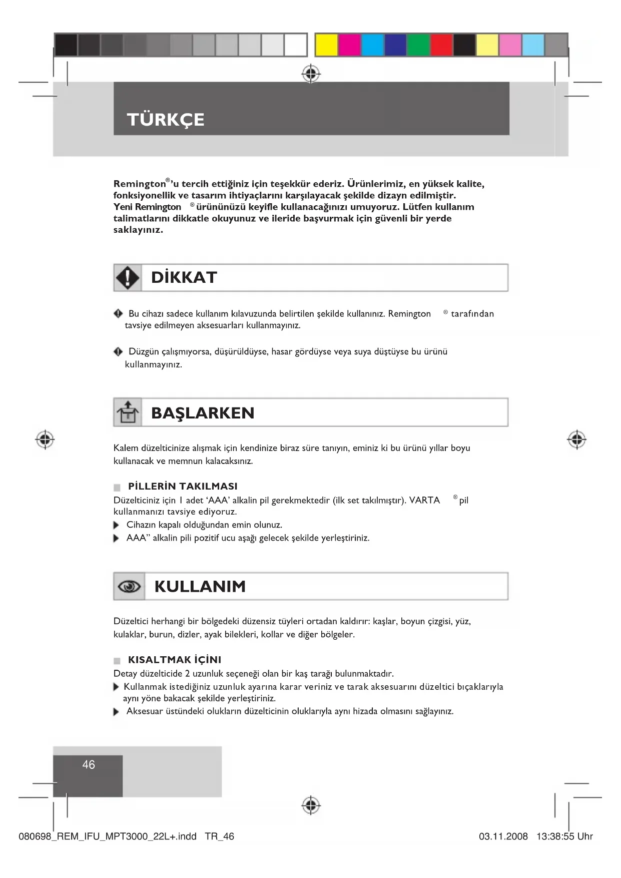 pil kullanmanızı tavsiye ediyoruz. Cihazın kapalı olduğundan emin olunuz. AAA” alkalin pili pozitif ucu aşağı gelecek şekilde yerleştiriniz. KULLANIM Düzeltici herhangi bir bölgedeki düzensiz tüyleri ortadan kaldırır: kaşlar, boyun çizgisi, yüz, kulaklar, burun, dizler, ayak bilekleri, kollar ve diğer bölgeler. KISALTMAK İÇİNI Detay düzelticide 2 uzunluk seçeneği olan bir kaş tarağı bulunmaktadır. Kullanmak istediğiniz uzunluk ayarına karar veriniz ve tarak aksesuarını düzeltici bıçaklarıyla aynı yöne bakacak şekilde yerleştiriniz. Aksesuar üstündeki olukların düzelticinin oluklarıyla aynı hizada olmasını sağlayınız. 080698_REM_IFU_MPT3000_22L+.indd TR_46080698_REM_IFU_MPT3000_22L+.indd TR_46 03.11.2008 13:38:55 Uhr03.11.2008 13:38:55 UhrTÜRKÇE