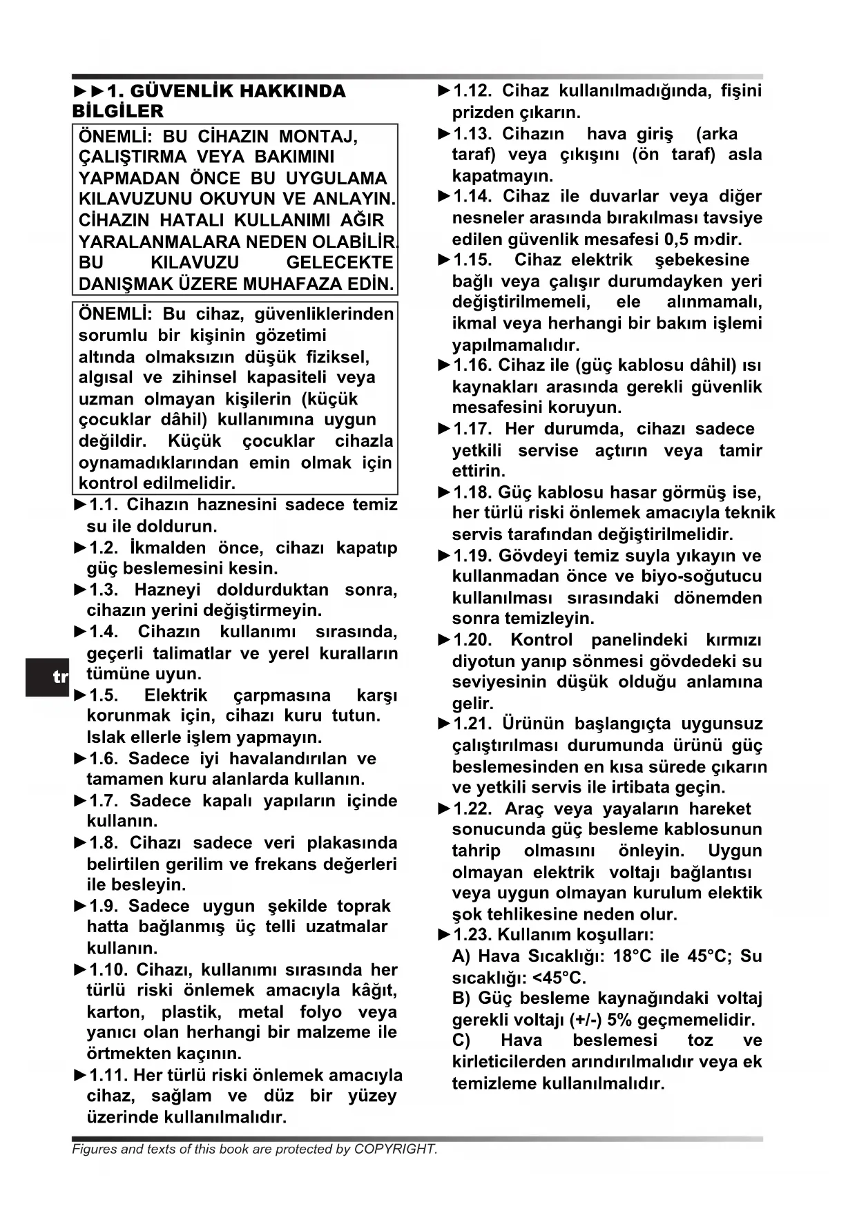 DANIŞMAK ÜZERE MUHAFAZA EDİN. ÖNEMLİ: Bu cihaz, güvenliklerinden sorumlu bir kişinin gözetimi altında olmaksızın düşük ziksel, algısal ve zihinsel kapasiteli veya uzman olmayan kişilerin (küçük çocuklar dâhil) kullanımına uygun değildir. Küçük çocuklar cihazla oynamadıklarından emin olmak için kontrol edilmelidir. ►1.1. Cihazın haznesini sadece temiz su ile doldurun. ►1.2. İkmalden önce, cihazı kapatıp güç beslemesini kesin. ►1.3. Hazneyi doldurduktan sonra, cihazın yerini değiştirmeyin. ►1.4. Cihazın kullanımı sırasında, geçerli talimatlar ve yerel kuralların tümüne uyun. ►1.5. Elektrik çarpmasına karşı korunmak için, cihazı kuru tutun. Islak ellerle işlem yapmayın. ►1.6. Sadece iyi havalandırılan ve tamamen kuru alanlarda kullanın. ►1.7. Sadece kapalı yapıların içinde kullanın. ►1.8. Cihazı sadece veri plakasında belirtilen gerilim ve frekans değerleri ile besleyin. ►1.9. Sadece uygun şekilde toprak hatta bağlanmış üç telli uzatmalar kullanın. ►1.10. Cihazı, kullanımı sırasında her türlü riski önlemek amacıyla kâğıt, karton, plastik, metal folyo veya yanıcı olan herhangi bir malzeme ile örtmekten kaçının. ►1.11. Her türlü riski önlemek amacıyla cihaz, sağlam ve düz bir yüzey üzerinde kullanılmalıdır. ►1.12. Cihaz kullanılmadığında, şini prizden çıkarın. ►1.13. Cihazın hava giriş (arka taraf) veya çıkışını (ön taraf) asla kapatmayın. ►1.14. Cihaz ile duvarlar veya diğer nesneler arasında bırakılması tavsiye edilen güvenlik mesafesi 0,5 m›dir. ►1.15. Cihaz elektrik şebekesine bağlı veya çalışır durumdayken yeri değiştirilmemeli, ele alınmamalı, ikmal veya herhangi bir bakım işlemi yapılmamalıdır. ►1.16. Cihaz ile (güç kablosu dâhil) ısı kaynakları arasında gerekli güvenlik mesafesini koruyun. ►1.17. Her durumda, cihazı sadece yetkili servise açtırın veya tamir ettirin. ►1.18. Güç kablosu hasar görmüş ise, her türlü riski önlemek amacıyla teknik servis tarafından değiştirilmelidir. ►1.19. Gövdeyi temiz suyla yıkayın ve kullanmadan önce ve biyo-soğutucu kullanılması sırasındaki dönemden sonra temizleyin. ►1.20. Kontrol panelindeki kırmızı diyotun yanıp sönmesi gövdedeki su seviyesinin düşük olduğu anlamına gelir. ►1.21. Ürünün başlangıçta uygunsuz çalıştırılması durumunda ürünü güç beslemesinden en kısa sürede çıkarın ve yetkili servis ile irtibata geçin. ►1.22. Araç veya yayaların hareket sonucunda güç besleme kablosunun tahrip olmasını önleyin. Uygun olmayan elektrik voltajı bağlantısı veya uygun olmayan kurulum elektik şok tehlikesine neden olur. ►1.23. Kullanım koşulları: A) Hava Sıcaklığı: 18°C ile 45°C; Su sıcaklığı: <45°C. B) Güç besleme kaynağındaki voltaj gerekli voltajı (+/-) 5% geçmemelidir. C) Hava beslemesi toz ve kirleticilerden arındırılmalıdır veya ek temizleme kullanılmalıdır. Figures and texts of this book are protected by COPYRIGHT.tr ►►2. AMBALAJDAN ÇIKARMA ►2.1. Cihazın paketlenmesinde ve sevkıyatında kullanılan tüm ambalaj malzemelerini çıkarın ve geçerli kanunlara göre bertaraf edin. ►2.2. Bütün parçaları ambalajdan çıkarın. ►2.3. Nakliye sırasında hasar oluşup oluşmadığını kontrol edin. Cihaz hasarlı görünüyorsa, derhal satın alındığı bayiliğe haber verin. ►►3. MONTAJ Cihaz, taşınmasını kolaylaştırmak amacıyla tekerlekler ile donatılmıştır. Tekerlekler, modele bağlı olarak monte edilmiş veya edilmemiş olabilir. Parçalar ve montaj için gerekli vida ve somunlar, ambalajın içindedir (Şek. 1). ►►4. İŞLETİMİ UYARI: Cihazı çalıştırmadan önce “GÜVENLİK HAKKINDA BİLGİLER” i dikkatle okuyun. UYARI: Arıza veya diğer aksaklıkları önlemek için sadece temiz su kullanın. UYARI: Elektrik tesisatınızın toprak bağlantısını kontrol edin. Elektrik bağlantısı, yürürlükteki ulusak düzenlemelere uygun olarak yapılmalıdır. Cihazı sadece veri plakasında belirtilen gerilim ve frekans değerleri ile besleyin. NOT: Bu modeller, boruyu tesisata bağlayarak su ana borusuna bağlanabilir (Şek. 10). ►►4.1. ÇALIŞTIRILMASI: ►4.1.1. Haznenin kapağını açın (Şek. 2). ►4.1.2. Tanka su ikmali yapın (Şek. 3); riskleri önlemek için su seviyesi, cihazın yan tarafında bulunan ölçek üzerindeki MIN ile MAX seviyeleri arasında olmalıdır (Şek. 4). ►4.1.3. Haznenin kapağını kapatın (Şek. 5). ►4.1.4. Cihazın şini şebeke prizine takın (Şek. 6). ►4.1.5. Cihazı çalıştırmak için ON/OFF düğmesine basın (Şek. 9).