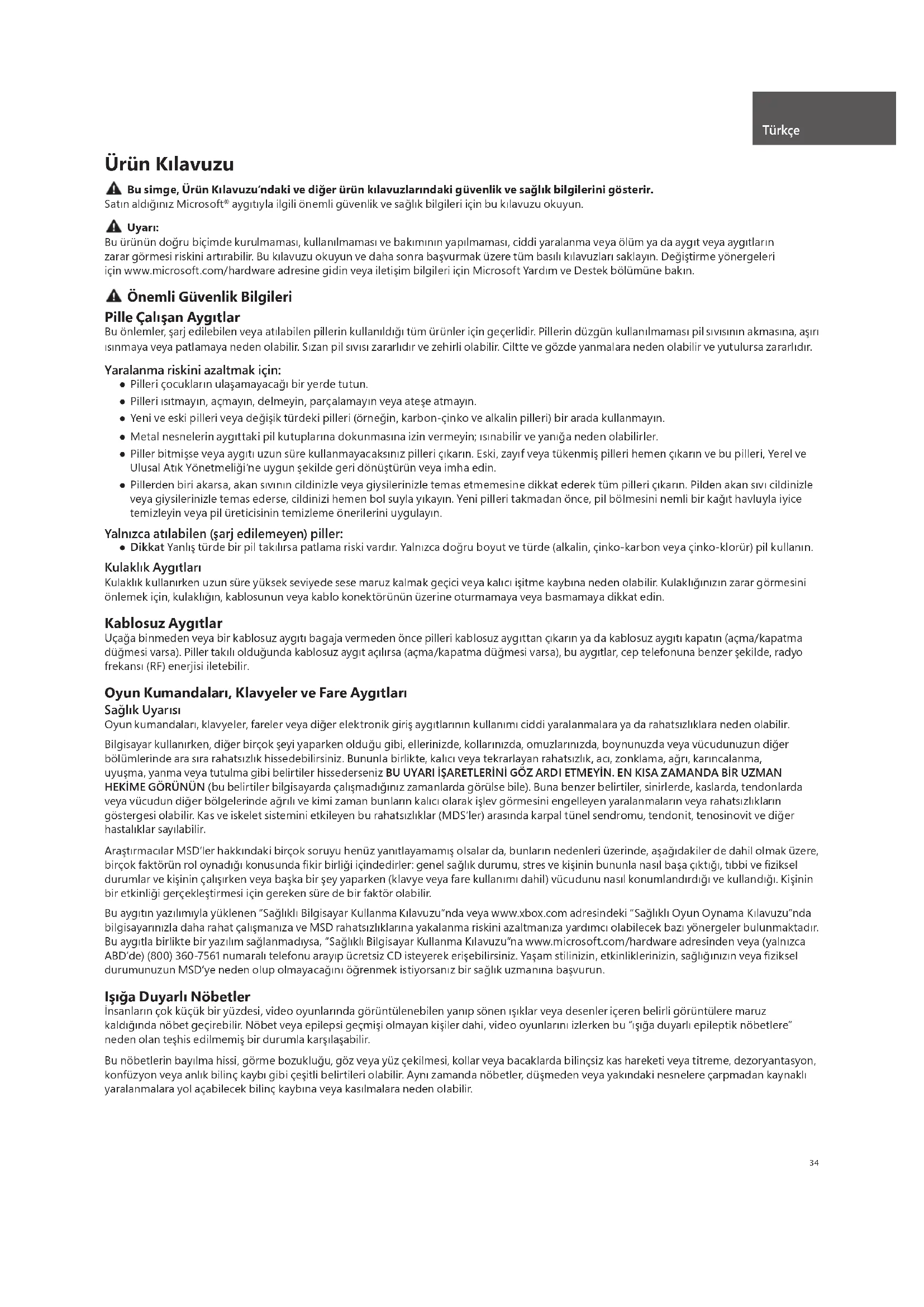 aygıtıyla ilgili önemli güvenlik ve sağlık bilgileri için bu kılavuzu okuyun. Uyarı: Bu ürünün doğru biçimde kurulmaması, kullanılmaması ve bakımının yapılmaması, ciddi yaralanma veya ölüm ya da aygıt veya aygıtların zarar görmesi riskini artırabilir. Bu kılavuzu okuyun ve daha sonra başvurmak üzere tüm basılı kılavuzları saklayın. Değiştirme yönergeleri için www.microsoft.com/hardware adresine gidin veya iletişim bilgileri için Microsoft Yardım ve Destek bölümüne bakın. Önemli Güvenlik Bilgileri Pille Çalışan Aygıtlar Bu önlemler, şarj edilebilen veya atılabilen pillerin kullanıldığı tüm ürünler için geçerlidir. Pillerin düzgün kullanılmaması pil sıvısının akmasına, aşırı ısınmaya veya patlamaya neden olabilir. Sızan pil sıvısı zararlıdır ve zehirli olabilir. Ciltte ve gözde yanmalara neden olabilir ve yutulursa zararlıdır. Yaralanma riskini azaltmak için: ● Pilleri çocukların ulaşamayacağı bir yerde tutun. ● Pilleri ısıtmayın, açmayın, delmeyin, parçalamayın veya ateşe atmayın. ● Yeni ve eski pilleri veya değişik türdeki pilleri (örneğin, karbon-çinko ve alkalin pilleri) bir arada kullanmayın. ● Metal nesnelerin aygıttaki pil kutuplarına dokunmasına izin vermeyin; ısınabilir ve yanığa neden olabilirler. ● Piller bitmişse veya aygıtı uzun süre kullanmayacaksınız pilleri çıkarın. Eski, zayıf veya tükenmiş pilleri hemen çıkarın ve bu pilleri, Yerel ve Ulusal Atık Yönetmeliği’ne uygun şekilde geri dönüştürün veya imha edin. ● Pillerden biri akarsa, akan sıvının cildinizle veya giysilerinizle temas etmemesine dikkat ederek tüm pilleri çıkarın. Pilden akan sıvı cildinizle veya giysilerinizle temas ederse, cildinizi hemen bol suyla yıkayın. Yeni pilleri takmadan önce, pil bölmesini nemli bir kağı t havluyla iyice temizleyin veya pil üreticisinin temizleme önerilerini uygulayın. Yalnızca atılabilen (şarj edilemeyen) piller: ● Dikkat Yanlış türde bir pil takılırsa patlama riski vardır. Yalnızca doğru boyut ve türde (alkalin, çinko-karbon veya çinko-klorür) pil kullanın. Kulaklık Aygıtları Kulaklık kullanırken uzun süre yüksek seviyede sese maruz kalmak geçici veya kalıcı işitme kaybına neden olabilir. Kulaklığınızın zarar görmesini önlemek için, kulaklığın, kablosunun veya kablo konektörünün üzerine oturmamaya veya basmamaya dikkat edin. Kablosuz Aygıtlar Uçağa binmeden veya bir kablosuz aygıtı bagaja vermeden önce pilleri kablosuz aygıttan çıkarın ya da kablosuz aygıtı kapatın (açma/kapatma düğmesi varsa). Piller takılı olduğunda kablosuz aygıt açılırsa (açma/kapatma düğmesi varsa), bu aygıtlar, cep telefonuna benzer şekilde, radyo frekansı (RF) enerjisi iletebilir. Oyun Kumandaları, Klavyeler ve Fare Aygıtları Sağlık Uyarısı Oyun kumandaları, klavyeler, fareler veya diğer elektronik giriş aygıtlarının kullanımı ciddi yaralanmalara ya da rahatsızlıklara neden olabilir. Bilgisayar kullanırken, diğer birçok şeyi yaparken olduğu gibi, ellerinizde, kollarınızda, omuzlarınızda, boynunuzda veya vücudunuzun diğer bölümlerinde ara sıra rahatsızlık hissedebilirsiniz. Bununla birlikte, kalıcı veya tekrarlayan rahatsızlık, acı, zonklama, ağrı, karıncalanma, uyuşma, yanma veya tutulma gibi belirtiler hissederseniz BU UYARI İŞARETLERİNİ GÖZ ARDI ETMEYİN. EN KISA ZAMANDA BİR UZMAN HEKİME GÖRÜNÜN (bu belirtiler bilgisayarda çalışmadığınız zamanlarda görülse bile). Buna benzer belirtiler, sinirlerde, kaslarda, tendonlarda veya vücudun diğer bölgelerinde ağrılı ve kimi zaman bunların kalıcı olarak işlev görmesini engelleyen yaralanmaların veya rahatsızlıkların göstergesi olabilir. Kas ve iskelet sistemini etkileyen bu rahatsızlıklar (MDS’ler) arasında karpal tünel sendromu, tendonit, tenosinovit ve diğer hastalıklar sayılabilir. Araştırmacılar MSD’ler hakkındaki birçok soruyu henüz yanıtlayamamış olsalar da, bunların nedenleri üzerinde, aşağıdakiler de dahil olmak üzere, birçok faktörün rol oynadığı konusunda fi kir birliği içindedirler: genel sağlık durumu, stres ve kişinin bununla nasıl başa çıktığı, tıbbi ve fi ziksel durumlar ve kişinin çalışırken veya başka bir şey yaparken (klavye veya fare kullanımı dahil) vücudunu nasıl konumlandırdığı ve kullandığı. Kişinin bir etkinliği gerçekleştirmesi için gereken süre de bir faktör olabilir. Bu aygıtın yazılımıyla yüklenen “Sağlıklı Bilgisayar Kullanma Kılavuzu”nda veya www.xbox.com adresindeki “Sağlıklı Oyun Oynama Kılavuzu”nda bilgisayarınızla daha rahat çalışmanıza ve MSD rahatsızlıklarına yakalanma riskini azaltmanıza yardımcı olabilecek bazı yönergeler bulunmaktadır. Bu aygıtla birlikte bir yazılım sağlanmadıysa, “Sağlıklı Bilgisayar Kullanma Kılavuzu”na www.microsoft.com/hardware adresinden veya (yalnızca ABD’de) (800) 360-7561 numaralı telefonu arayıp ücretsiz CD isteyerek erişebilirsiniz. Yaşam stilinizin, etkinliklerinizin, sağlığınızın veya fi ziksel durumunuzun MSD’ye neden olup olmayacağını öğrenmek istiyorsanız bir sağlık uzmanına başvurun. Işığa Duyarlı Nöbetler İnsanların çok küçük bir yüzdesi, video oyunlarında görüntülenebilen yanıp sönen ışıklar veya desenler içeren belirli görüntülere maruz kaldığında nöbet geçirebilir. Nöbet veya epilepsi geçmişi olmayan kişiler dahi, video oyunlarını izlerken bu “ışığa duyarlı epileptik nöbetlere” neden olan teşhis edilmemiş bir durumla karşılaşabilir. Bu nöbetlerin bayılma hissi, görme bozukluğu, göz veya yüz çekilmesi, kollar veya bacaklarda bilinçsiz kas hareketi veya titreme, dezoryantasyon, konfüzyon veya anlık bilinç kaybı gibi çeşitli belirtileri olabilir. Aynı zamanda nöbe