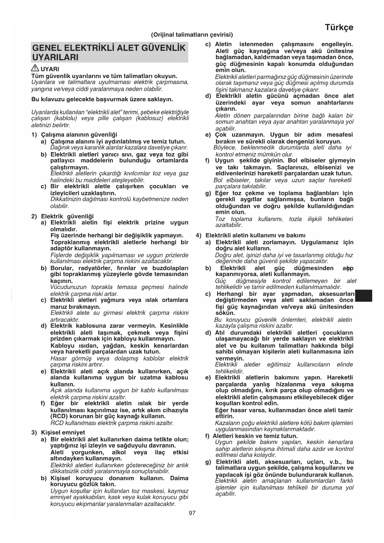 a) Elektrikli aleti zorlamayın. Uygulamanız için doğru alet kullanın. Doğru alet, işinizi daha iyi ve tasarlanmış olduğu hız değerinde daha güvenli şekilde yapacaktır. b) Elektrikli alet güç düğmesinden açı lıp kapanmıyorsa, aleti kullanmayın. Güç düğmesiyle kontrol edilemeyen bir alet tehlikelidir ve tamir edilmeden kullanılmamalıdır. c) Herhangi bir ayar yapmadan, aksesuarları değiştirmeden veya aleti saklamadan önce fi şi güç kaynağından ve/veya akü ünitesinden sökün. Bu koruyucu güvenlik önlemleri, elektrikli aletin kazayla çalışma riskini azaltır. d) Atıl durumdaki elektrikli aletleri çocukların ulaşamayacağı bir yerde saklayın ve elektrikli alet ve bu kullanım talimatları hakkında bilgi sahibi olmayan kişilerin aleti kullanmasına izin vermeyin. Elektrikli aletler eğitimsiz kullanıcıların elinde tehlikelidir. e) Elektrikli aletlerin bakımını yapın. Hareketli parçalarda yanlış hizalanma veya sıkışma olup olmadığını , kırık parça olup olmadığını ve elektrikli aletin çalışmasını etkileyebilecek diğer koşulları kontrol edin. Eğer hasar varsa, kullanmadan önce aleti tamir ettirin. Kazaların çoğu elektrikli aletlere kötü bakım işlemleri uygulanmasından kaynaklanmaktadır. f) Aletleri keskin ve temiz tutun. Uygun şekilde bakımı yapılan, keskin kenarlara sahip aletlerin sıkışma ihtimali daha azdır ve kontrol edilmesi daha kolaydır. g) Elektrikli aleti, aksesuarları, uçları, v.b., bu talimatlara uygun şekilde, çalışma koşullarını ve yapılacak işi göz önünde bulundurarak kullanın. Elektrikli aletin amaçlanan kullanımlardan farklı işlemler için kullanılması tehlikeli bir duruma yol açabilir. GENEL ELEKTRİKLİ ALET GÜVENLİK UYARILARI UYARI Tüm güvenlik uyarılarını ve tüm talimatları okuyun. Uyarılara ve talimatlara uyulmaması elektrik çarpmasına, yangına ve/veya ciddi yaralanmaya neden olabilir. Bu kılavuzu gelecekte başvurmak üzere saklayın. Uyarılarda kullanılan “elektrikli alet” terimi, şebeke elektriğiyle çalışan (kablolu) veya pille çalışan (kablosuz) elektrikli aletinizi belirtir.