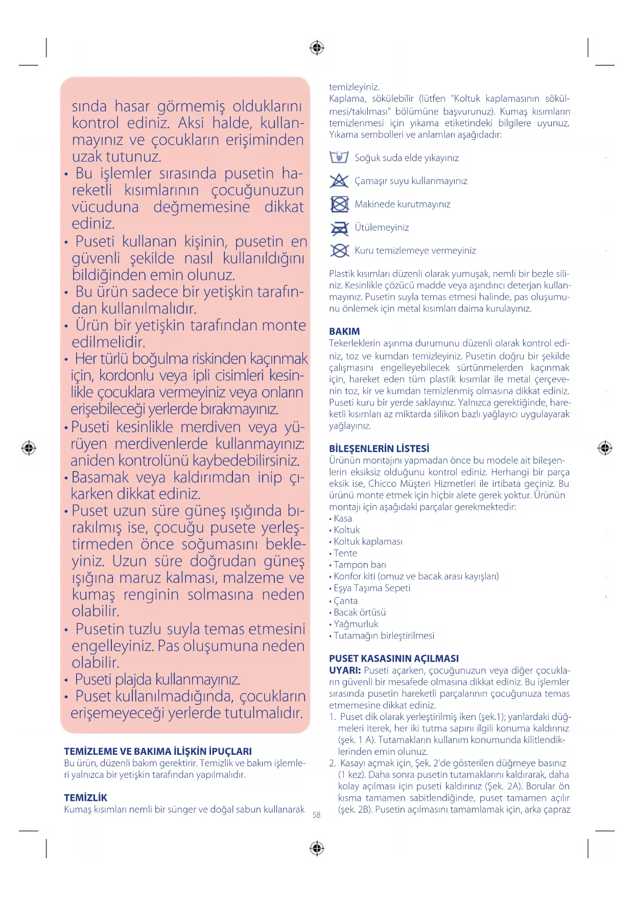 temizleyiniz. Kaplama, sökülebilir (lütfen "Koltuk kaplamasının sökül- mesi/takılması" bölümüne başvurunuz). Kumaş kısımların temizlenmesi için yıkama etiketindeki bilgilere uyunuz. Yıkama sembolleri ve anlamları aşağıdadır: Soğuk suda elde yıkayınız Çamaşır suyu kullanmayınız Makinede kurutmayınız Ütülemeyiniz Kuru temizlemeye vermeyiniz Plastik kısımları düzenli olarak yumuşak, nemli bir bezle sili- niz. Kesinlikle çözücü madde veya aşındırıcı deterjan kullan- mayınız. Pusetin suyla temas etmesi halinde, pas oluşumu- nu önlemek için metal kısımları daima kurulayınız. BAKIM Tekerleklerin aşınma durumunu düzenli olarak kontrol edi- niz, toz ve kumdan temizleyiniz. Pusetin doğru bir şekilde çalışmasını engelleyebilecek sürtünmelerden kaçınmak için, hareket eden tüm plastik kısımlar ile metal çerçeve- nin toz, kir ve kumdan temizlenmiş olmasına dikkat ediniz. Puseti kuru bir yerde saklayınız. Yalnızca gerektiğinde, hare- ketli kısımları az miktarda silikon bazlı yağlayıcı uygulayarak yağlayınız.