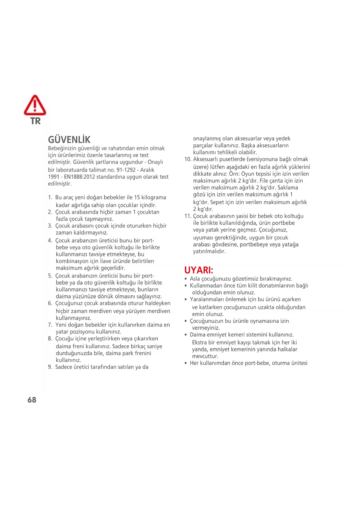 ile birlikte kullanıldığında, ürün portbebe veya yatak yerine geçmez. Çocuğunuz, uyuması gerektiğinde, uygun bir çocuk arabası gövdesine, portbebeye veya yatağa yatırılmalıdır. UYARI: