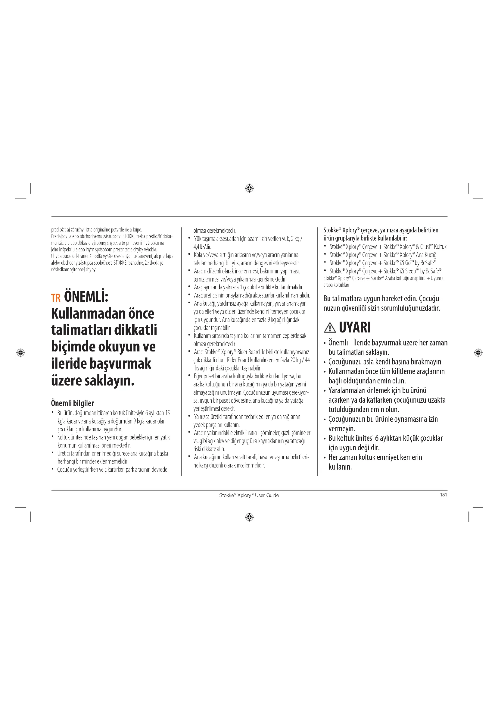 predložiť aj záručný list a originálne potvrdenie o kúpe. Predajcovi alebo obchodnému zástupcovi STOKKE treba predložiť doku- mentáciu alebo dôkaz o výrobnej chybe, a to prinesením výrobku na jeho inšpekciu alebo iným spôsobom prezentácie chyby výrobku. Chyba bude odstránená podľa vyššie uvedených ustanovení, ak predajca alebo obchodný zástupca spoločnosti STOKKE rozhodne, že škoda je dôsledkom výrobnej chyby. TR ÖNEMLİ: Kullanmadan önce talimatları dikkatli biçimde okuyun ve ileride başvurmak üzere saklayın. Önemli bilgiler Bu ürün, doğumdan itibaren koltuk ünitesiyle 6 aylıktan 15 kg'a kadar ve ana kucağıyla doğumdan 9 kg'a kadar olan çocuklar için kullanıma uygundur. Koltuk ünitesinde taşınan yeni doğan bebekler için en yatık konumun kullanılması önerilmektedir. Üretici tarafından önerilmediği sürece ana kucağına başka herhangi bir minder eklenmemelidir. Çocuğu yerleştirirken ve çıkartırken park aracının devrede olması gerekmektedir. Yük taşıma aksesuarları için azami izin verilen yük, 2 kg / 4,4 lbs'dir. Kola ve/veya sırtlığın arkasına ve/veya aracın yanlarına takılan herhangi bir yük, aracın dengesini etkileyecektir. Aracın düzenli olarak incelenmesi, bakımının yapılması, temizlenmesi ve/veya yıkanması gerekmektedir. Araç aynı anda yalnızca 1 çocuk ile birlikte kullanılmalıdır. Araç üreticisinin onaylamadığı aksesuarlar kullanılmamalıdır. Ana kucağı, yardımsız ayağa kalkamayan, yuvarlanamayan ya da elleri veya dizleri üzerinde kendini itemeyen çocuklar için uygundur. Ana kucağında en fazla 9 kg ağırlığındaki çocuklar taşınabilir Kullanım sırasında taşıma kollarının tamamen ceplerde saklı olması gerekmektedir. Aracı Stokke® Xplory® Rider Board ile birlikte kullanıyorsanız çok dikkatli olun. Rider Board kullanılırken en fazla 20 kg / 44 lbs ağırlığındaki çocuklar taşınabilir Eğer puset bir araba koltuğuyla birlikte kullanılıyorsa, bu araba koltuğunun bir ana kucağının ya da bir yatağın yerini almayacağını unutmayın. Çocuğunuzun uyuması gerekiyor- sa, uygun bir puset gövdesine, ana kucağına ya da yatağa yerleştirilmesi gerekir. Yalnızca üretici tarafından tedarik edilen ya da sağlanan yedek parçaları kullanın. Aracın yakınındaki elektrikli ısıtıcılı şömineler, gazlı şömineler vs. gibi açık alev ve diğer güçlü ısı kaynaklarının yaratacağı riski dikkate alın. Ana kucağının kolları ve alt tarafı, hasar ve aşınma belirtileri- ne karşı düzenli olarak incelenmelidir. Stokke® Xplory® çerçeve, yalnızca aşağıda belirtilen ürün gruplarıyla birlikte kullanılabilir: Stokke® Xplory® Çerçeve + Stokke® Xplory® & Crusi™ Koltuk Stokke® Xplory® Çerçeve + Stokke® Xplory® Ana Kucağı Stokke® Xplory® Çerçeve + Stokke® iZi Go™ by BeSafe® Stokke® Xplory® Çerçeve + Stokke® iZi Sleep™ by BeSafe® Stokke® Xplory® Çerçeve + Stokke® Araba koltuğu adaptörü + Uyumlu araba koltukları Bu talimatlara uygun hareket edin. Çocuğu- nuzun güvenliği sizin sorumluluğunuzdadır. UYARI