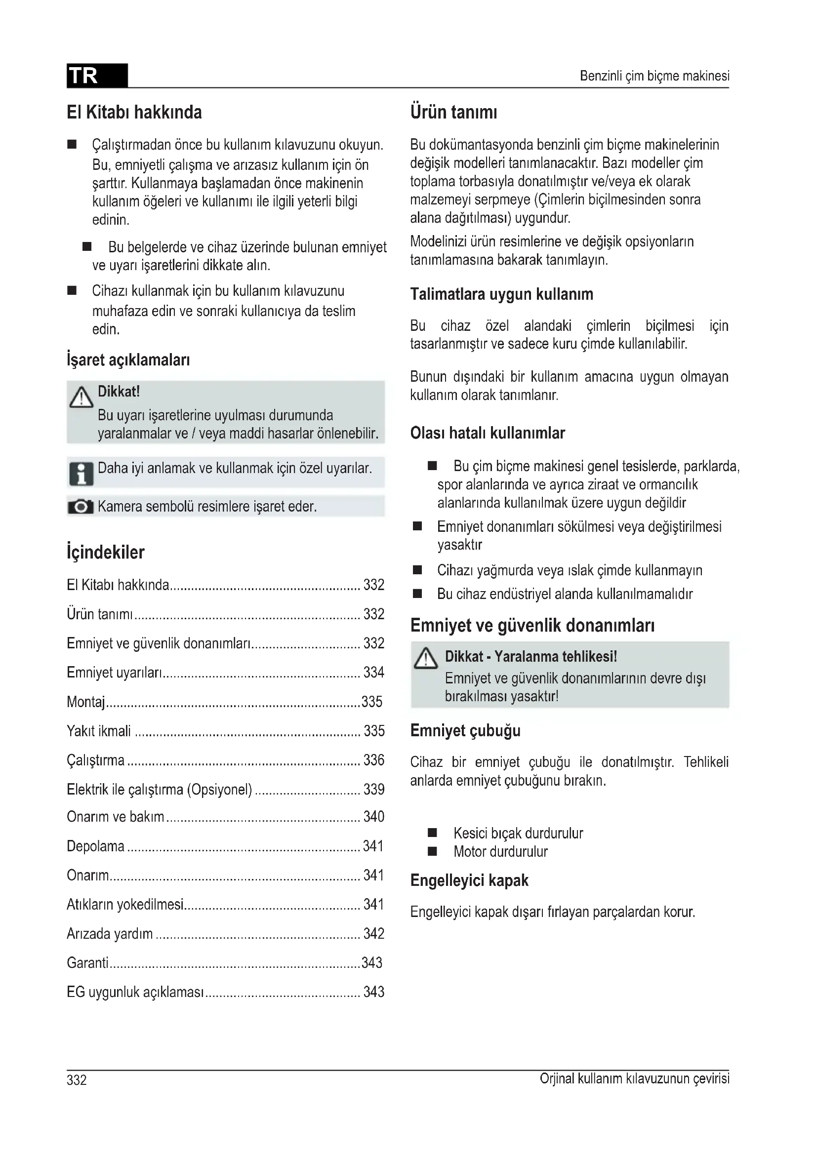 - Benzinli çim biçme makinesi İçindekiler El Kitabı hakkında p. 332