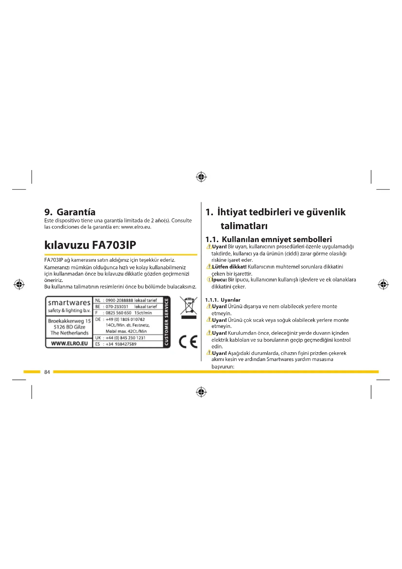 Este dispositivo tiene una garantía limitada de 2 año(s). Consulte las condiciones de la garantía en: www.elro.eu. kılavuzu FA703IP FA703IP ağ kamerasını satın aldığınız için teşekkür ederiz. Kameranızı mümkün olduğunca hızlı ve kolay kullanabilmeniz için kullanmadan önce bu kılavuzu dikkatle gözden geçirmenizi öneririz. Bu kullanma talimatının resimlerini önce bu bölümde bulacaksınız.85 Lütfen dikkat! Kamerayı doğrudan güneş ışığından koruyun. Lütfen dikkat! Kamerayı çalılara, dallara veya diğer hareketli cisimlere doğru tutmayın. Lütfen dikkat! Ürün ayrıştırılmamış kentsel atık olarak imha edilemez, ayrı ayrı işleme tabi tutulmalıdır. Lütfen dikkat! Artık kullanılmadığında ürünü bölgenizde nereye teslim edebileceğiniz hakkında bilgi edinin. Elektrikli cihazları ve parçalarını atmayın, ürünün (veya parçalarının) dönüşümü ve yeniden kullanılabilmesi için nereye teslim edilebileceğini öğrenin. Lütfen dikkat! Kablosuz sistemler, 2,4 GHz aralığında çalışan kablosuz telefonlar, mikrodalga fırınlar ve diğer kablosuz cihazlar tarafından bozulabilir. Ürün, kurulum ve kullanım sırasında potansiyel arıza kaynaklarından en az 3 metre uzakta tutulmalıdır. Lütfen dikkat! Kamera geceleri camdan göremez. Konumlandırırken bunu göz önünde bulundurun.