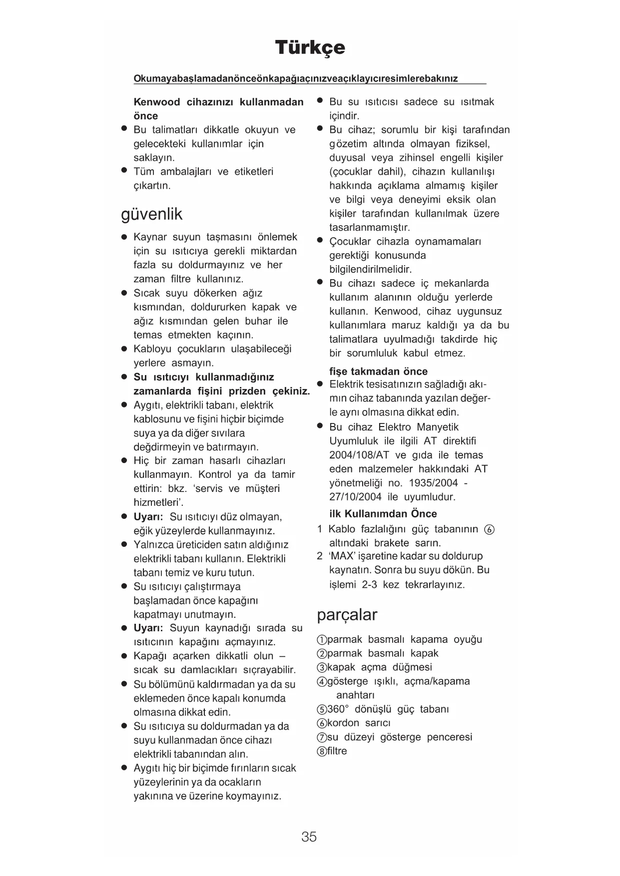 Bu cihaz Elektro Manyetik Uyumluluk ile ilgili AT direktifi 2004/108/AT ve gıda ile temas eden malzemeler hakkındaki AT yönetmeliği no. 1935/2004 - 27/10/2004 ile uyumludur. ilk Kullanımdan Önce 1 Kablo fazlalığını güç tabanının altındaki brakete sarın. 2 ‘MAX’ iflaretine kadar su doldurup kaynat›n. Sonra bu suyu dökün. Bu i…lemi 2-3 kez tekrarlayınız. parçalar parmak basmalı kapama oyuğu parmak basmalı kapak kapak açma düğmesi gösterge ışıklı, açma/kapama anahtarı 360° dönüşlü güç tabanı kordon sarıcı su düzeyi gösterge penceresi filtre Türkçe