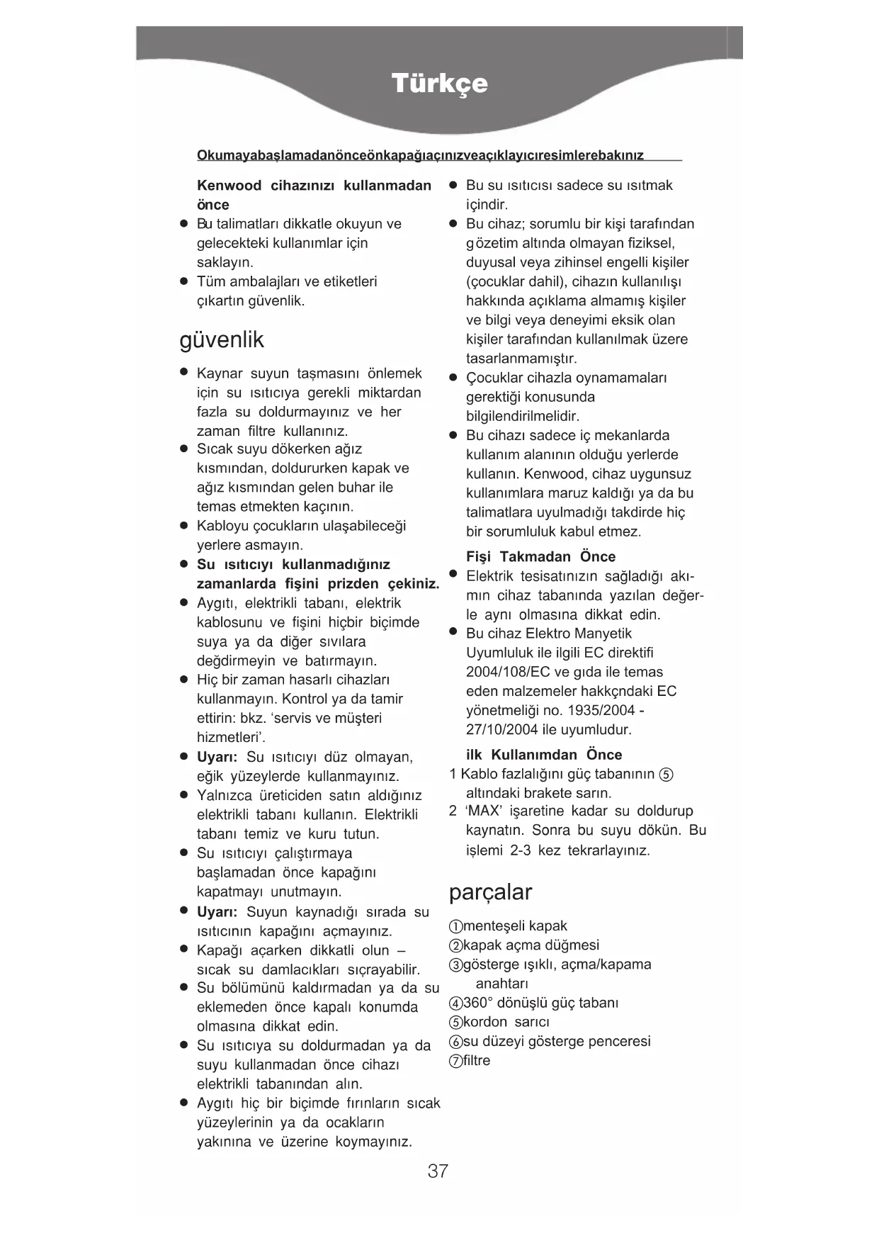 Bu cihaz Elektro Manyetik Uyumluluk ile ilgili EC direktifi 2004/108/EC ve gıda ile temas eden malzemeler hakkçndaki EC yönetmeliği no. 1935/2004 - 27/10/2004 ile uyumludur. ilk Kullanımdan Önce 1 Kablo fazlalığını güç tabanının altındaki brakete sarın. 2 ‘MAX’ iflaretine kadar su doldurup kaynat›n. Sonra bu suyu dökün. Bu i…lemi 2-3 kez tekrarlayınız. parçalar menteşeli kapak kapak açma düğmesi gösterge ışıklı, açma/kapama anahtarı 360° dönüşlü güç tabanı kordon sarıcı su düzeyi gösterge penceresi filtre Türkçe