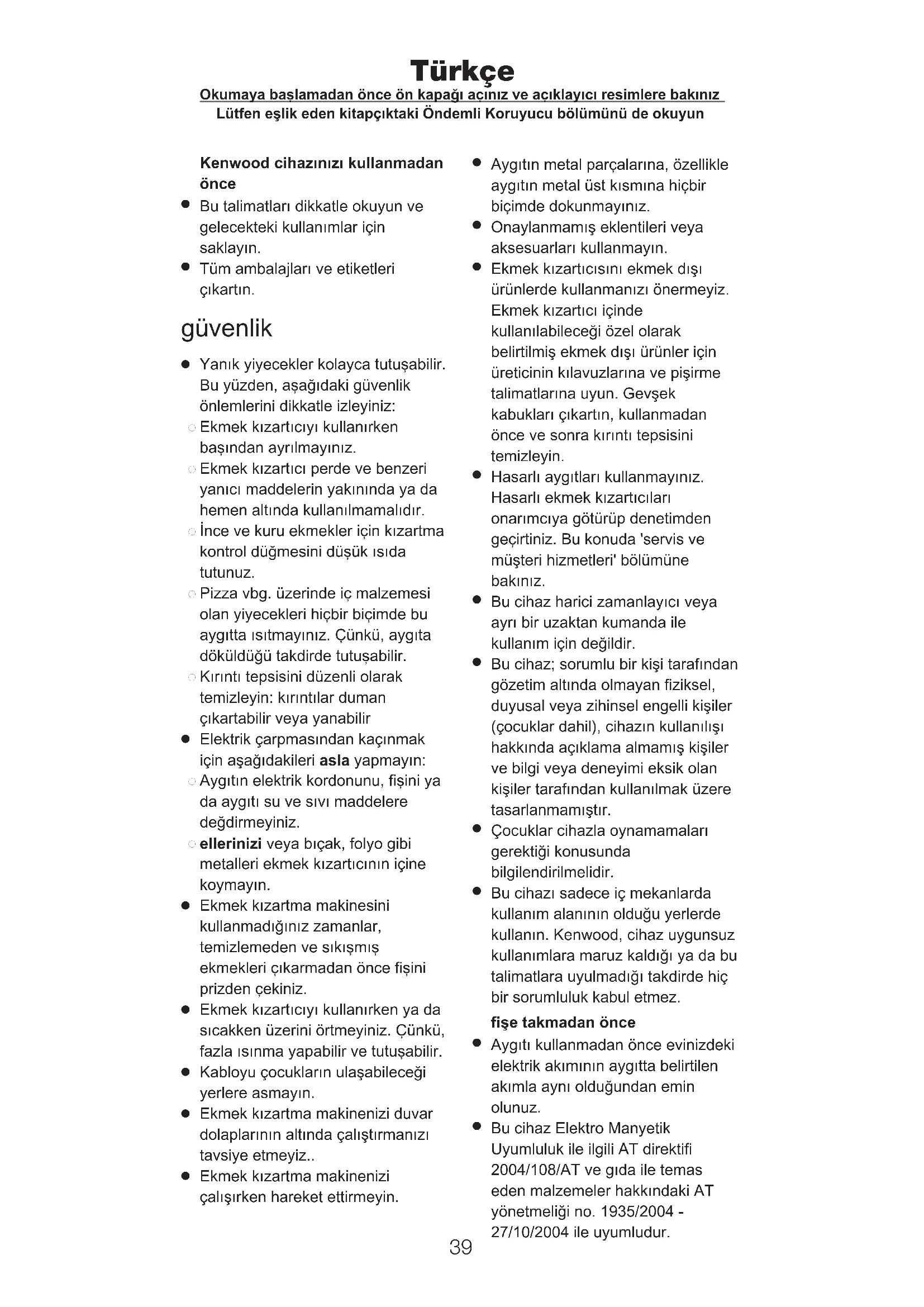Bu cihazı sadece iç mekanlarda kullanım alanının olduğu yerlerde kullanın. Kenwood, cihaz uygunsuz kullanımlara maruz kaldığı ya da bu talimatlara uyulmadığı takdirde hiç bir sorumluluk kabul etmez. fişe takmadan önce