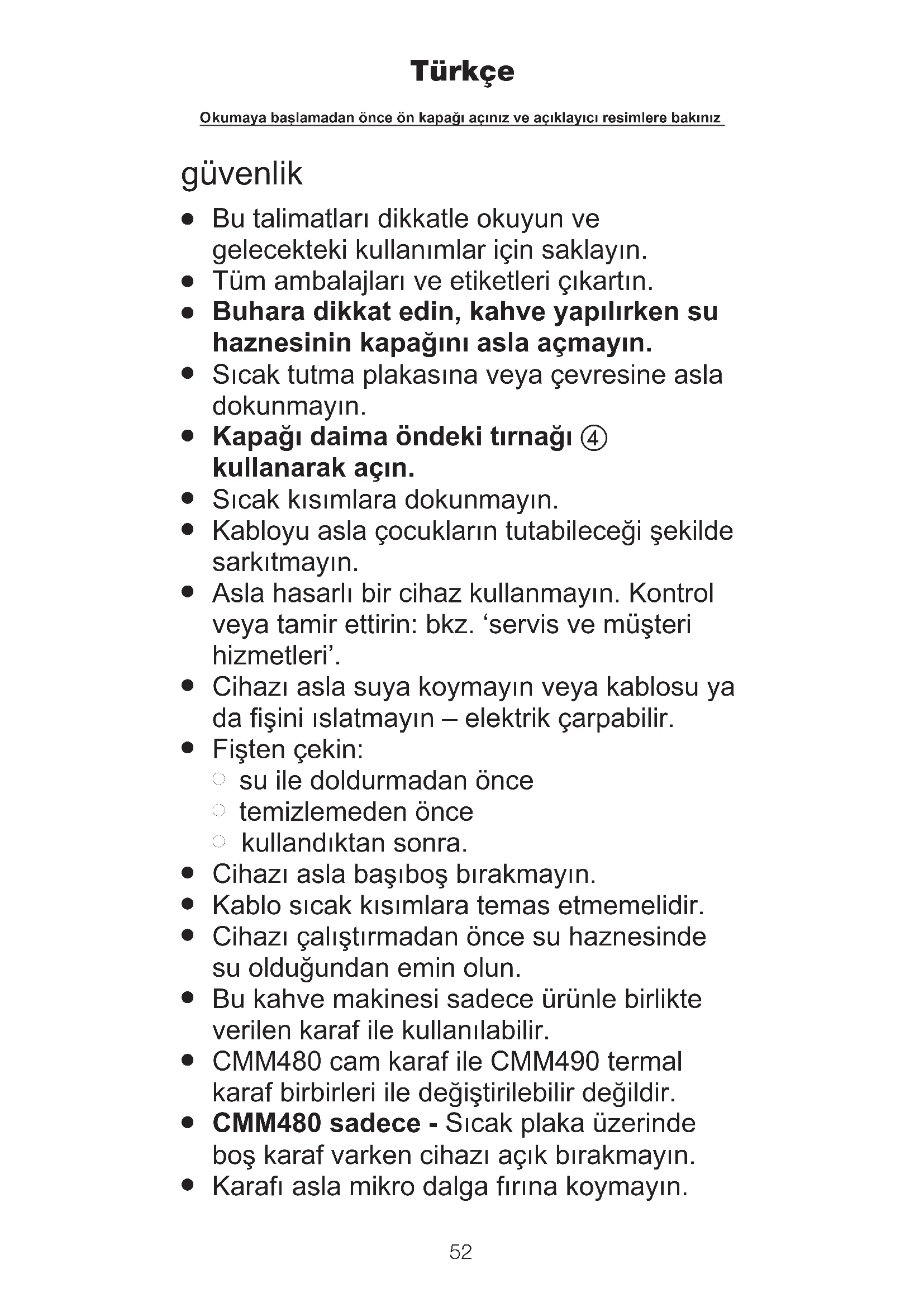ıcak/yerleştirme plakası üzerine yerleştirin. Not: Kapağın tamamen kapalı olduğundan emin olun. Kapak doğru şekilde kapatılmamışsa, damlama önleyici valf çalışmayacaktır, bunun neticesinde filtre tutucu aşırı dolarak tutucu alanından dışarı su saçılmasına yol açacaktır. 6 Fişe takın ve çalıştırın. 7 Kahve yapılması bitine kadar karafı çıkartmayın. CMM490 Termal Karaf – karaftan kahve doldurmak için, kapağı itin, kolu aşağı doğru serbest bırakın Karafı boşaltmak ve temizlemek için kapağı, kapak serbest bırakma kolunu saat yönünün tersine döndürerek çıkartın ve kaldırın. 8 Karaf boşken, kapatın ve cihazın fişini çekin. Sadece CMM480