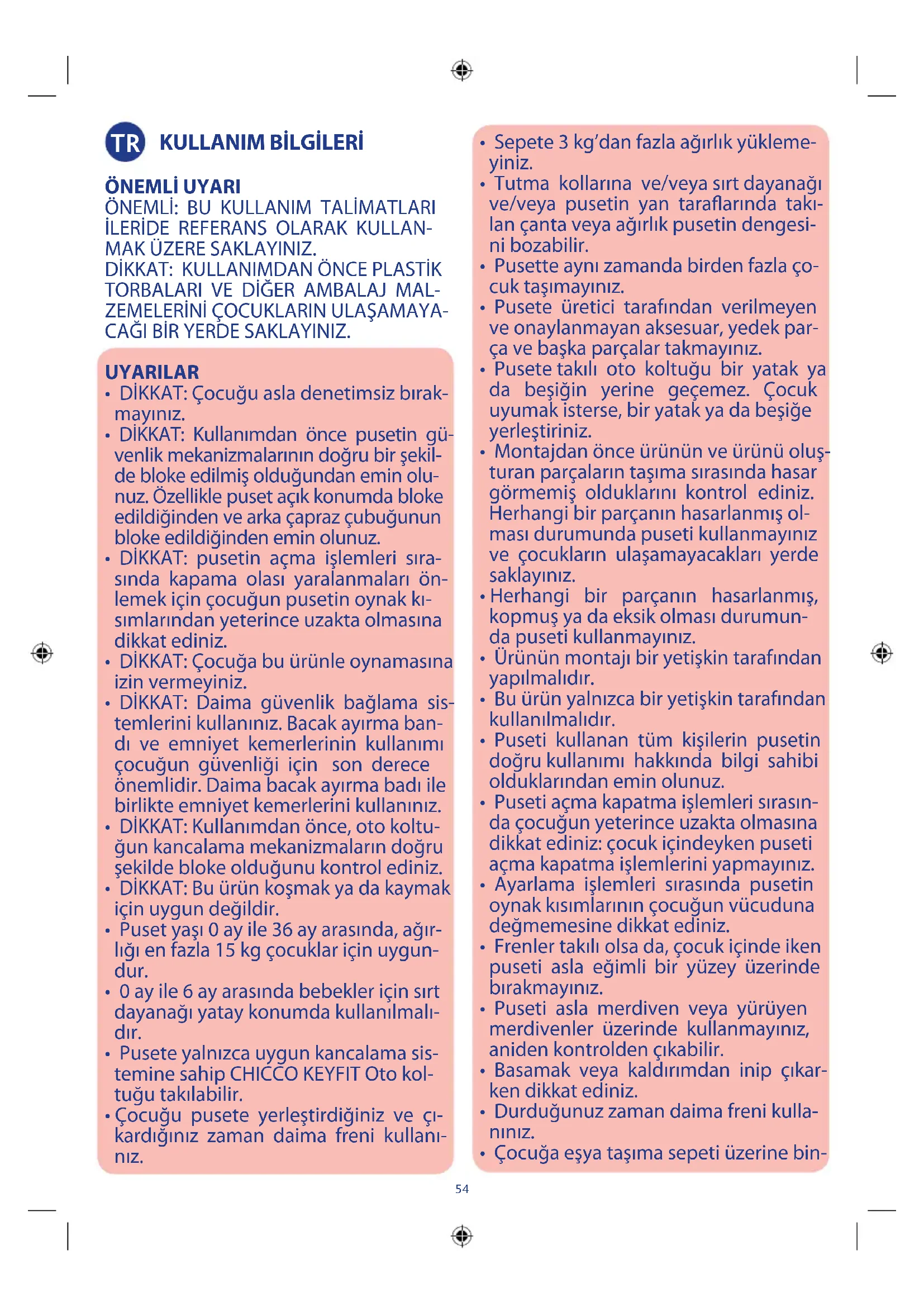 - DİKKAT: Kullanımdan önce pusetin gü- venlik mekanizmalarının doğru bir şekil- de bloke edilmiş olduğundan emin olu- nuz. Özellikle puset açık konumda bloke edildiğinden ve arka çapraz çubuğunun bloke edildiğinden emin olunuz.