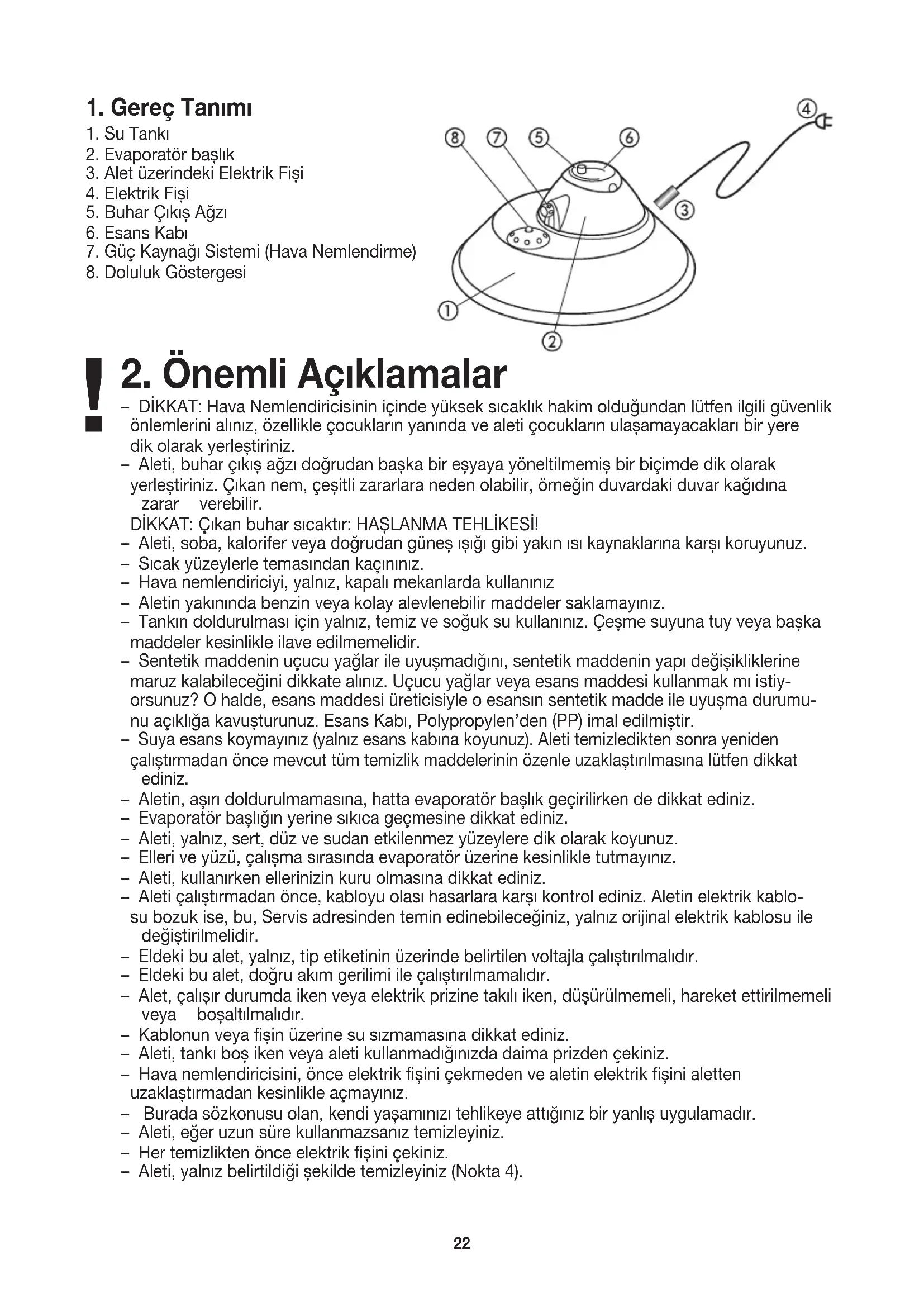 – DİKKAT: Hava Nemlendiricisinin içinde yüksek sıcaklık hakim olduğundan lütfen ilgili güvenlik önlemlerini alınız, özellikle çocukların yanında ve aleti çocukların ulașamayacakları bir yere dik olarak yerleștiriniz. – Aleti, buhar çıkıș ağzı doğrudan bașka bir eșyaya yöneltilmemiș bir biçimde dik olarak yerleștiriniz. Çıkan nem, çeșitli zararlara neden olabilir, örneğin duvardaki duvar kağıdına zarar verebilir. DİKKAT: Çıkan buhar sıcaktır: HAȘLANMA TEHLİKESİ! – Aleti, soba, kalorifer veya doğrudan güneș ıșığı gibi yakın ısı kaynaklarına karșı koruyunuz. – Sıcak yüzeylerle temasından kaçınınız. – Hava nemlendiriciyi, yalnız, kapalı mekanlarda kullanınız – Aletin yakınında benzin veya kolay alevlenebilir maddeler saklamayınız. – Tankın doldurulması için yalnız, temiz ve soğuk su kullanınız. Çeșme suyuna tuy veya bașka maddeler kesinlikle ilave edilmemelidir. – Sentetik maddenin uçucu yağlar ile uyușmadığını, sentetik maddenin yapı değișikliklerine maruz kalabileceğini dikkate alınız. Uçucu yağlar veya esans maddesi kullanmak mı istiy- orsunuz? O halde, esans maddesi üreticisiyle o esansın sentetik madde ile uyușma durumu- nu açıklığa kavușturunuz. Esans Kabı, Polypropylen’den (PP) imal edilmiștir.