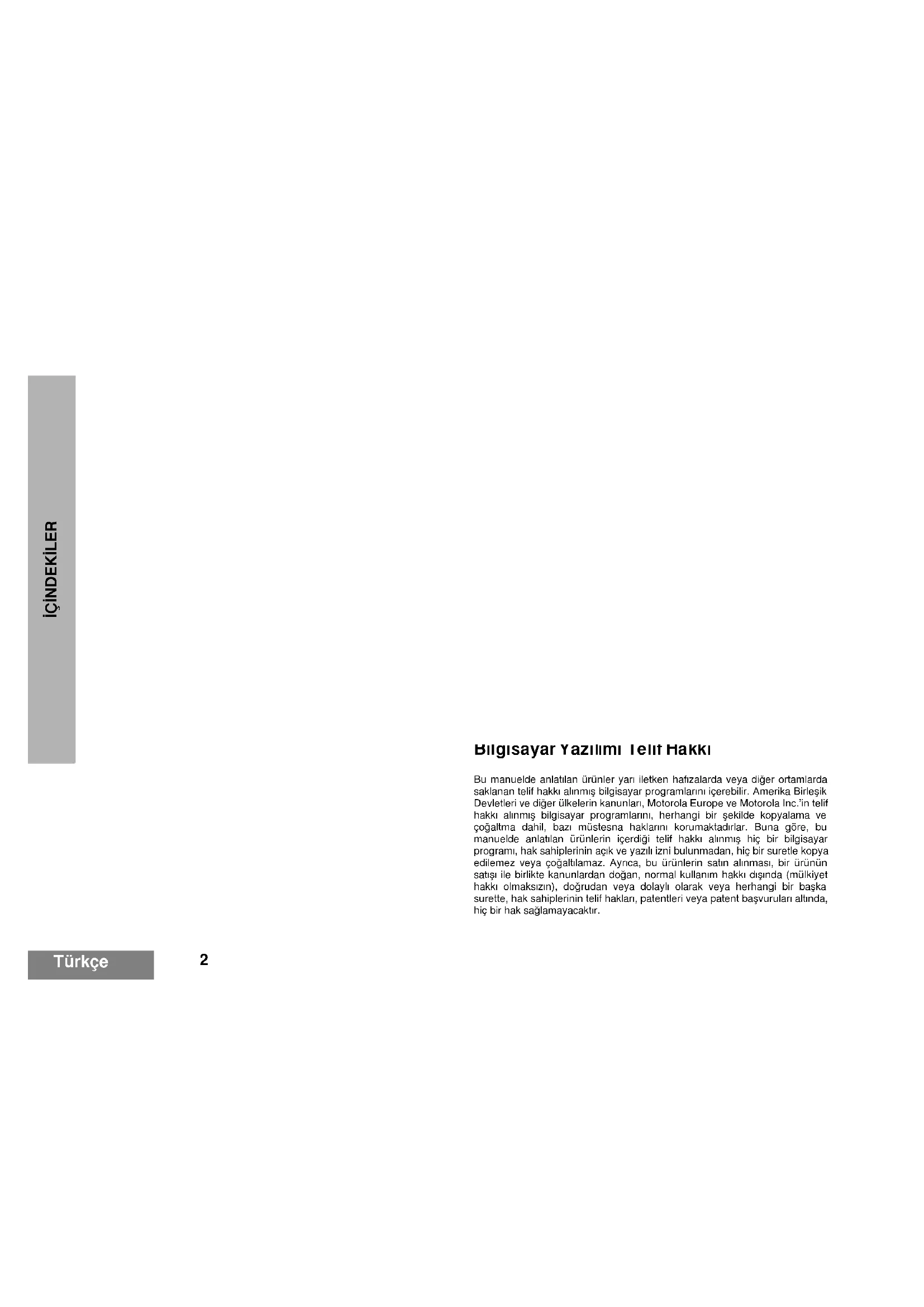 Bu manuelde anlatýlan ürünler yarý iletken hafýzalarda veya diðer ortamlarda saklanan telif hakký alýnmýþ bilgisayar programlarýný içerebilir. Amerika Birleþik Devletleri ve diðer ülkelerin kanunlarý, Motorola Europe ve Motorola Inc.’in telif hakký alýnmýþ bilgisayar programlarýný, herhangi bir þekilde kopyalama ve çoðaltma dahil, bazý müstesna haklarýný korumaktadýrlar. Buna göre, bu manuelde anlatýlan ürünlerin içerdiði telif hakký alýnmýþ hiç bir bilgisayar programý, hak sahiplerinin açýk ve yazýlý izni bulunmadan, hiç bir suretle kopya edilemez veya çoðaltýlamaz. Ayrýca, bu ürünlerin satýn alýnmasý, bir ürünün satýþý ile birlikte kanunlardan doðan, normal kullaným hakký dýþýnda (mülkiyet hakký olmaksýzýn), doðrudan veya dolaylý olarak veya herhangi bir baþka surette, hak sahiplerinin telif haklarý, patentleri veya patent baþvurularý altýnda, hiç bir hak saðlamayacaktýr. CP040_TK.fm Page 2 Thursday, October 2, 2003 11:29 AM3 Türkçe