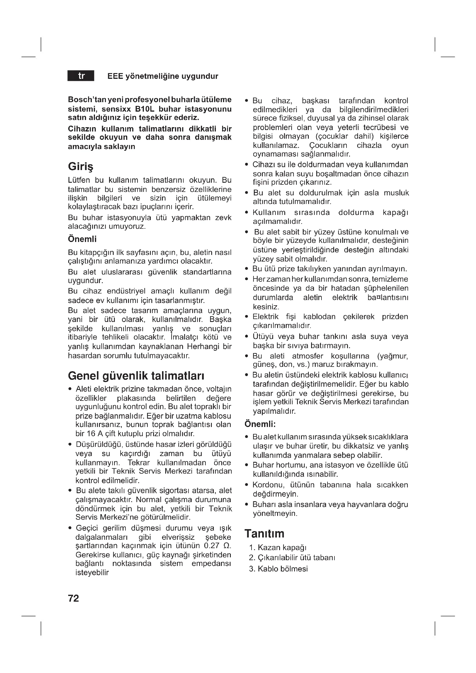Το κουμπί εξόδου ατμού (12) είναι πατημένο για μεγάλο χρονικό διάστημα Πατήστε το κουμπί του ατμού κατά διαστήματα. Αυτό βελτιώνει το αποτέλεσμα του σιδερώματος, μιας και το ύφασμα θα στεγνώσει καλύτερα και θα παραμείνει περισσότερο απαλό An oi prohgo¥meneq syståseiq den l¥noyn to prøblhma, epikoinvneºste me ™na ejoysiodothm™no texnikø maq s™rbiq. Ayt¸ h syskey¸ xarakthrºzetai s¥mfvna me thn eyrvpa›k¸ odhgºa 2002/96/EK perº hlektrik˜n kai hlektronik˜n syskey˜n (waste electrical and electronic equipment - WEEE). H odhgºa prokauorºzei ta plaºsia gia mia apøsyrsh kai ajiopoºhsh tvn pali˜n syskey˜n me isx¥ s’ ølh thn EE. Μπορείτε να μεταφορτώσετε αυτό το εγχειρίδιο από τη τοπική ιστοσελίδα της Bosch.72 Bosch’tan yeni profesyonel buharla ütüleme sistemi, sensixx B10L buhar istasyonunu satın aldığınız için teşekkür ederiz. Cihazın kullanım talimatlarını dikkatli bir sekilde okuyun ve daha sonra danışmak amacıyla saklayın Giriş Lütfen bu kullanım talimatlarını okuyun. Bu talimatlar bu sistemin benzersiz özelliklerine ilişkin bilgileri ve sizin için ütülemeyi kolaylaştıracak bazı ipuçlarını içerir. Bu buhar istasyonuyla ütü yapmaktan zevk alacağınızı umuyoruz. Önemli Bu kitapçığın ilk sayfasını açın, bu, aletin nasıl çalıştığını anlamanıza yardımcı olacaktır. Bu alet uluslararası güvenlik standartlarına uygundur. Bu cihaz endüstriyel amaçlı kullanım değil sadece ev kullanımı için tasarlanmıştır. Bu alet sadece tasarım amaçlarına uygun, yani bir ütü olarak, kullanılmalıdır. Başka şekilde kullanılması yanlış ve sonuçları itibariyle tehlikeli olacaktır. İmalatçı kötü ve yanlış kullanımdan kaynaklanan Herhangi bir hasardan sorumlu tutulmayacaktır. Genel güvenlik talimatları
