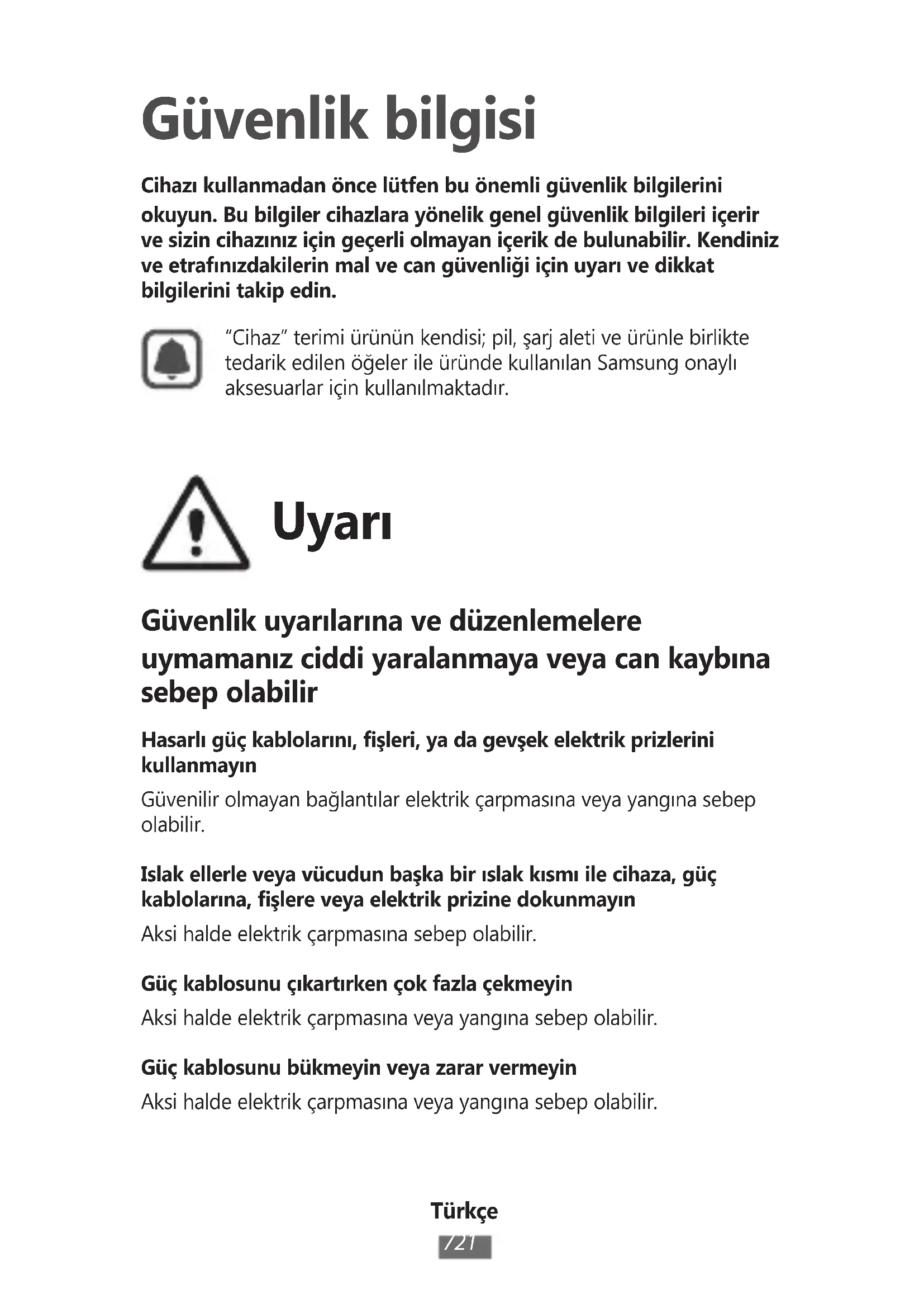 Güvenlik bilgisi Cihazı kullanmadan önce lütfen bu önemli güvenlik bilgilerini okuyun. Bu bilgiler cihazlara yönelik genel güvenlik bilgileri içerir ve sizin cihazınız için geçerli olmayan içerik de bulunabilir. Kendiniz ve etrafınızdakilerin mal ve can güvenliği için uyarı ve dikkat bilgilerini takip edin.“Cihaz” terimi ürünün kendisi; pil, şarj aleti ve ürünle birlikte tedarik edilen öğeler ile üründe kullanılan Samsung onaylı aksesuarlar için kullanılmaktadır. Uyarı Güvenlik uyarılarına ve düzenlemelere uymamanız ciddi yaralanmaya veya can kaybına sebep olabilir Hasarlı güç kablolarını, fişleri, ya da gevşek elektrik prizlerini kullanmayınGüvenilir olmayan bağlantılar elektrik çarpmasına veya yangına sebep olabilir.Islak ellerle veya vücudun başka bir ıslak kısmı ile cihaza, güç kablolarına, fişlere veya elektrik prizine dokunmayınAksi halde elektrik çarpmasına sebep olabilir.Güç kablosunu çıkartırken çok fazla çekmeyinAksi halde elektrik çarpmasına veya yangına sebep olabilir.Güç kablosunu bükmeyin veya zarar vermeyinAksi halde elektrik çarpmasına veya yangına sebep olabilir.Türkçe